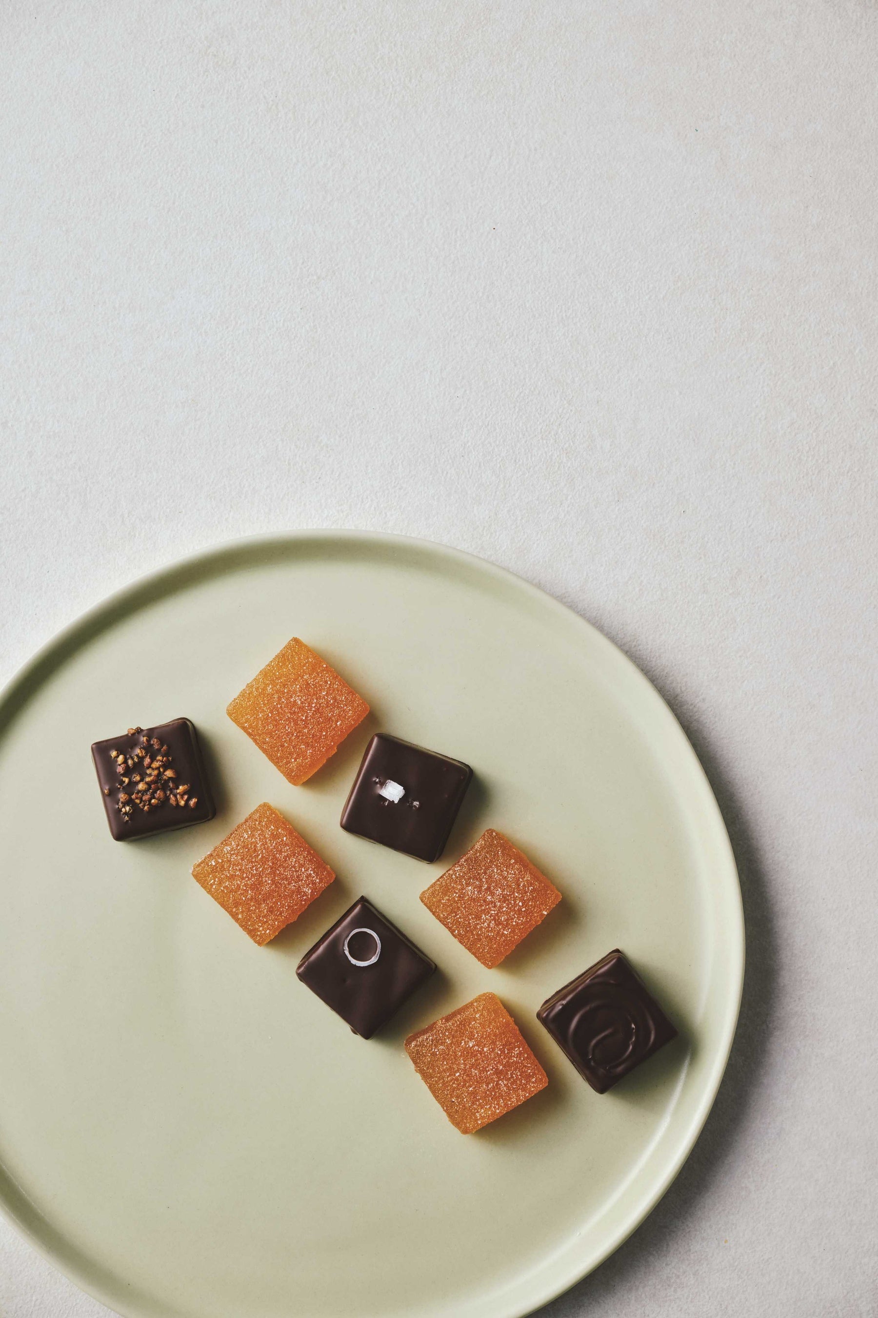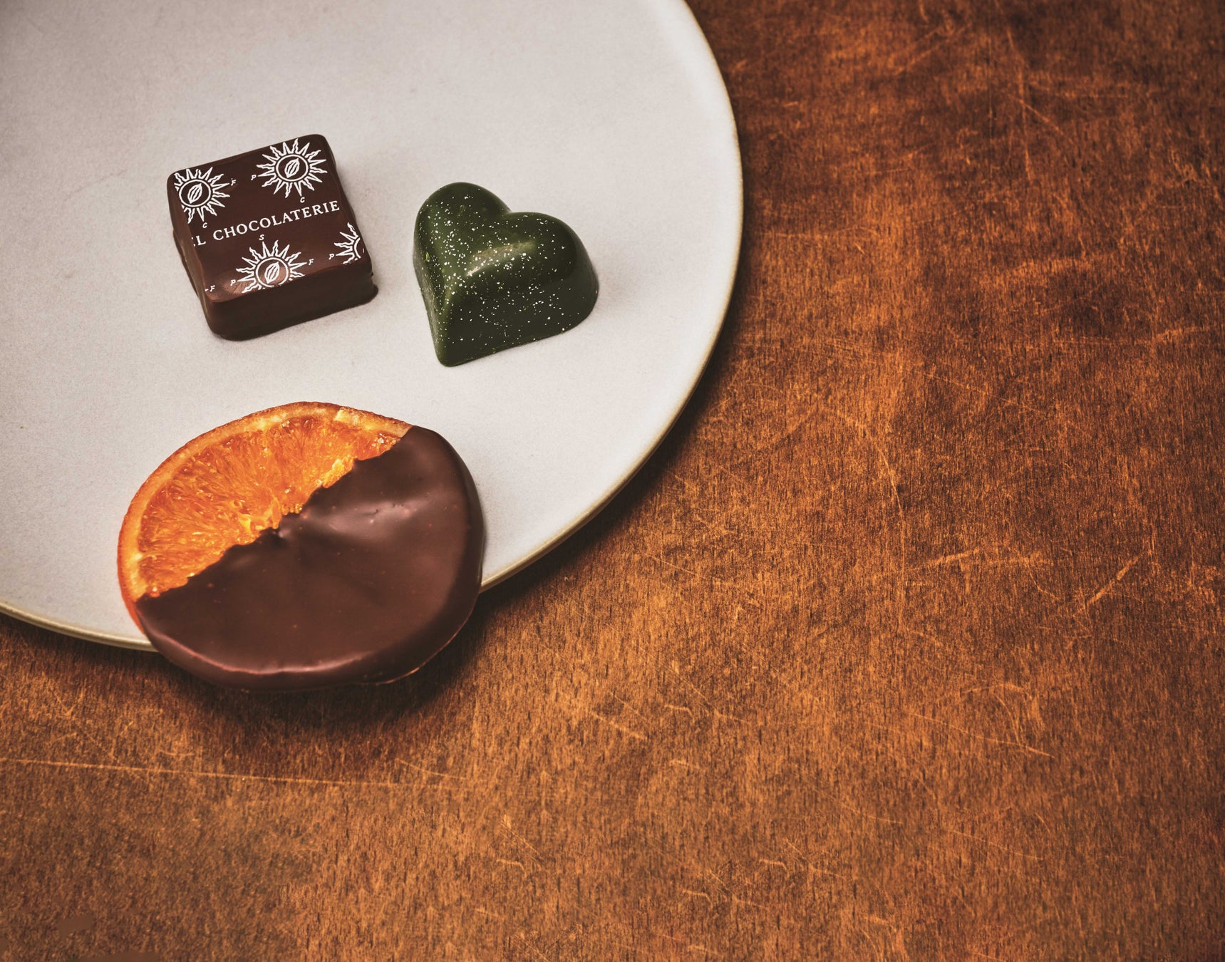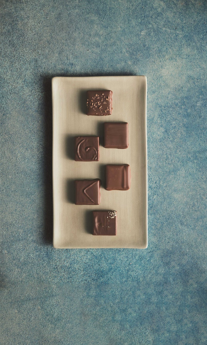 瀬戸内で育ったネーブルオレンジを香ばしいサモア産ダークチョコレートでコーティングしたオランジェットに、瀬戸内産レモンピューレと自ら焙煎したサモア産カカオ75%のダークチョコレートのボンボンと、濃厚な自家製抹茶チョコレートと甘いミルクのマリアージュが楽しめるボンボンのセット。