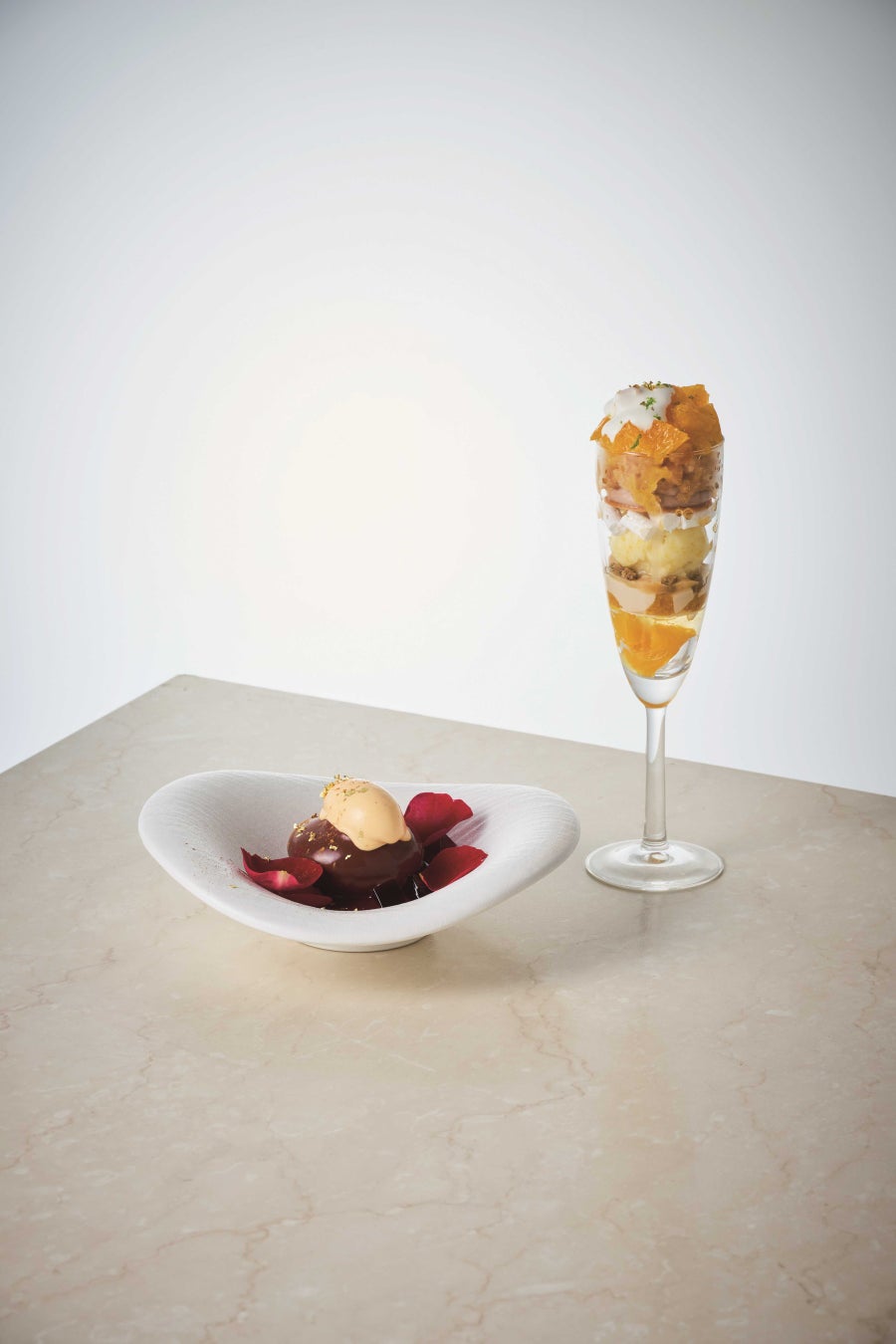 小田原の「ブラッドオレンジ」、「不知火」をはじめとする柑橘を紅茶やショコラとマリアージュさせたパフェに、温かいフォンダンショコラと冷たいバニラアイスのコントラストや薔薇とフランボワーズのエレンガントな香りを楽しめるデザートが登場。