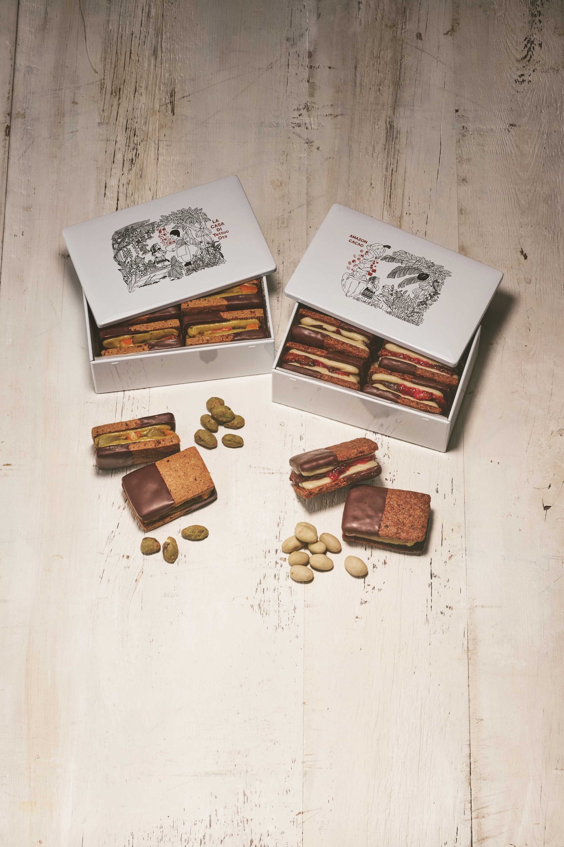 アマゾンカカオをクッキー生地に使用した2種のクッキー缶。自家製の洋梨コンフィチュール・ブラッドオレンジのコンフィチュールをピスタチオバタークリームでサンドしたクッキーと、自家製の信州産プルーンのコンフィチュールとプラムのジャムを、バタークリームとともにサンドしたクッキーです。