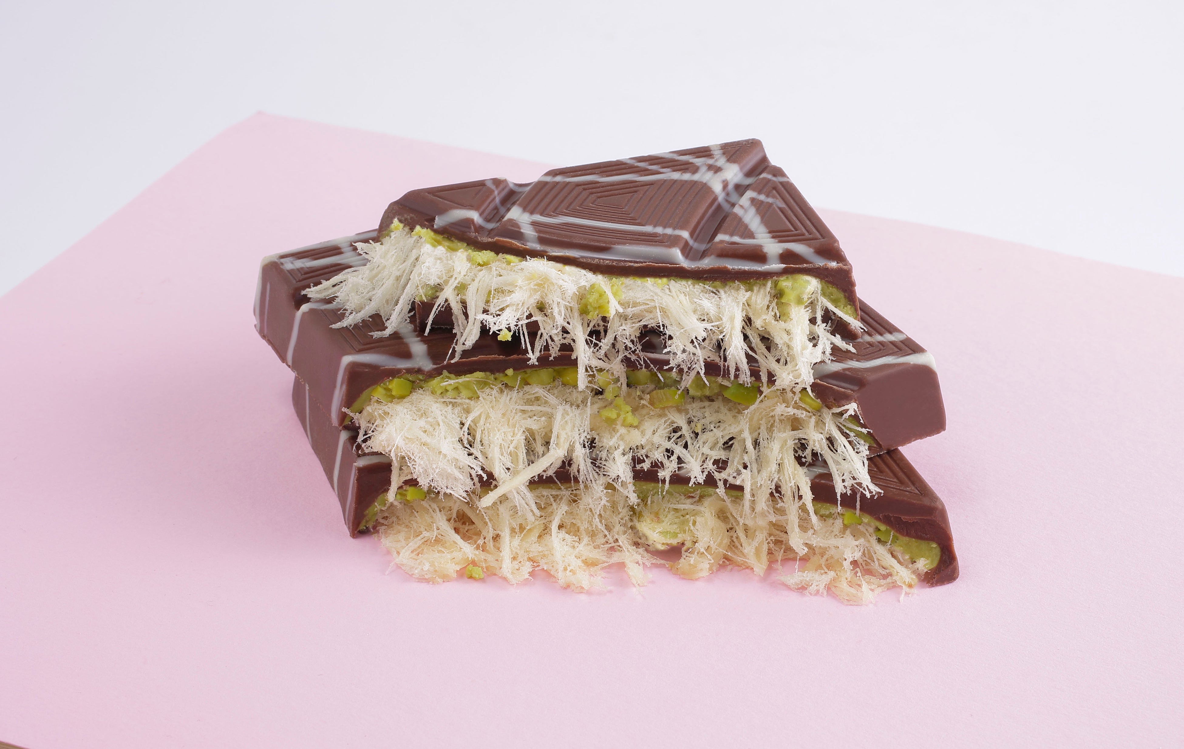 トルコの伝統菓子「ピシュマニエ」とチョコレート、ピスタチオが融合した、贅沢かつ新感覚なチョコレート。見た目が髪の毛のように細い糸状のピシュマニエの断面が特徴で、そのビジュアルインパクトから、ドバイチョコレートの進化系としてSNSで注目を集めています。