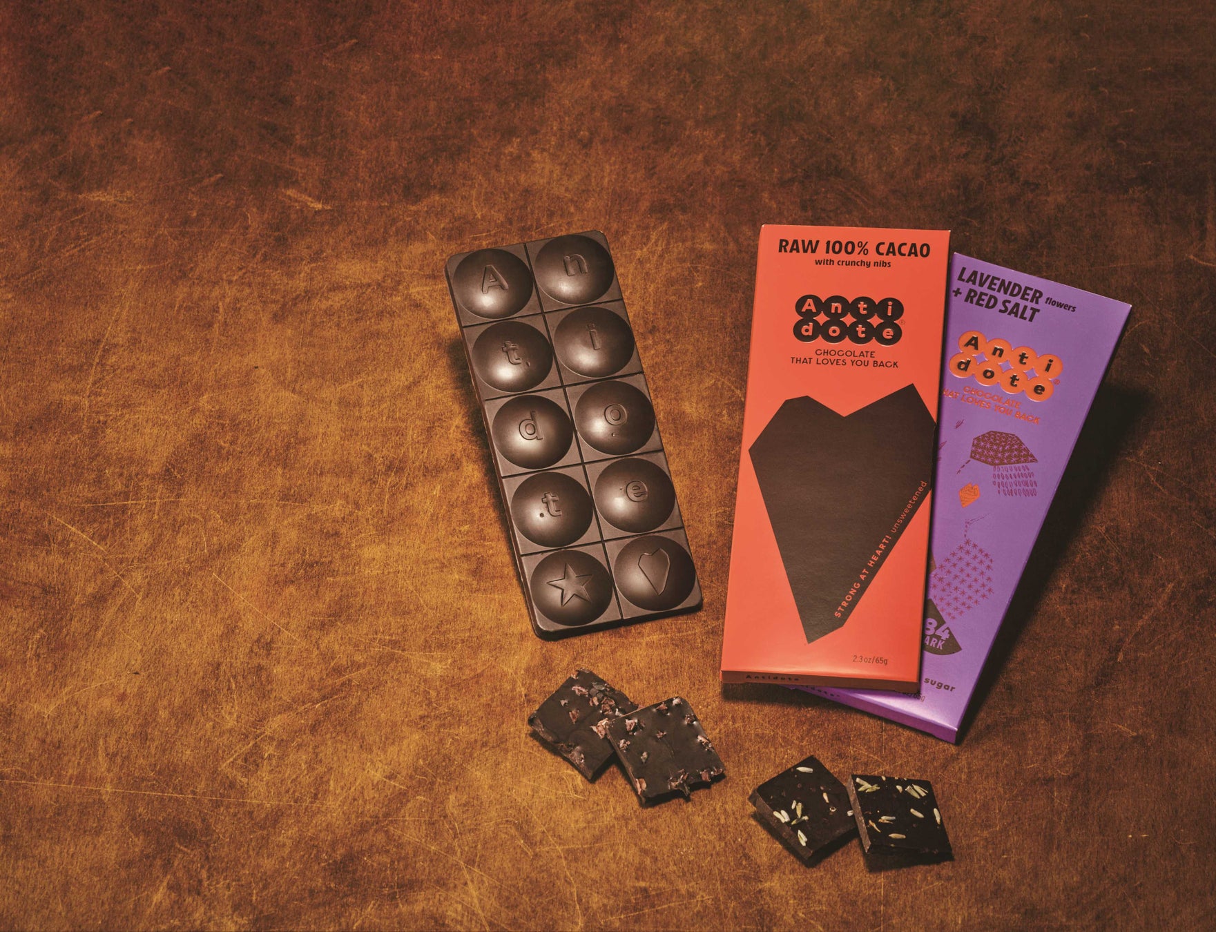 低温焙煎カカオ84%のダークチョコレートにラベンダーと赤いアレエア塩を加えたタブレットは、ひときわ強く香りたつフローラルな風味が特徴。ローカカオ100%のチョコレートにカカオニブを加えたタブレットは、ナッティーな風味と芳醇な香り、カカオニブの食感が唯一無二のハーモニーを奏でます。