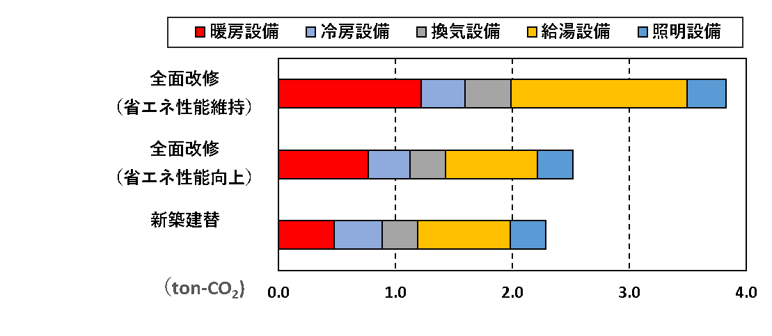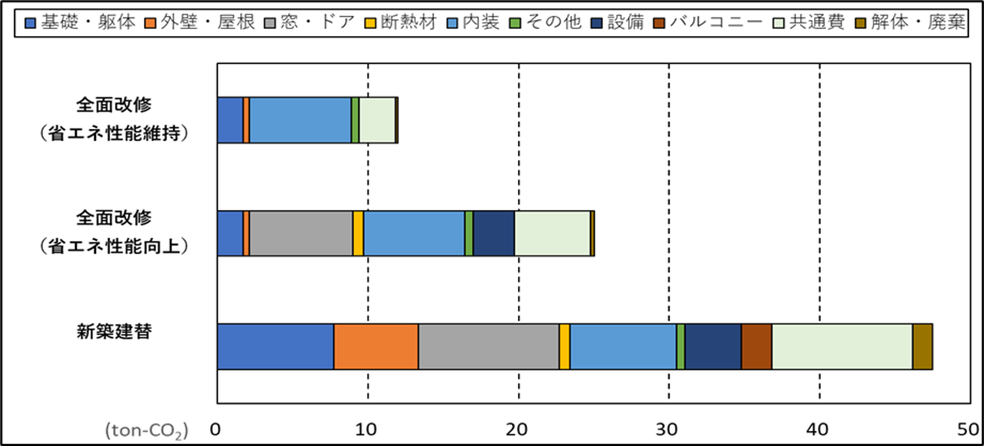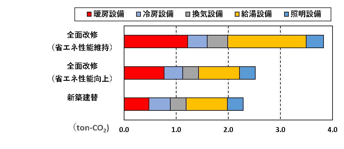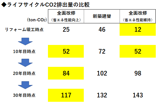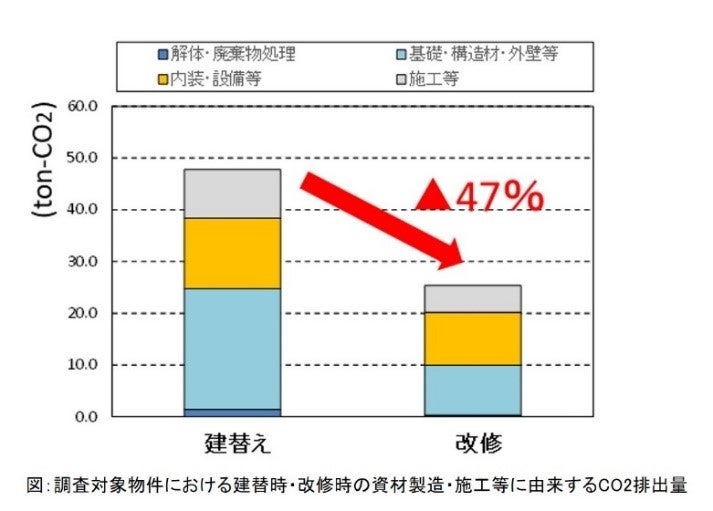 ➡新築建替対比、改修の排出量は47%削減される