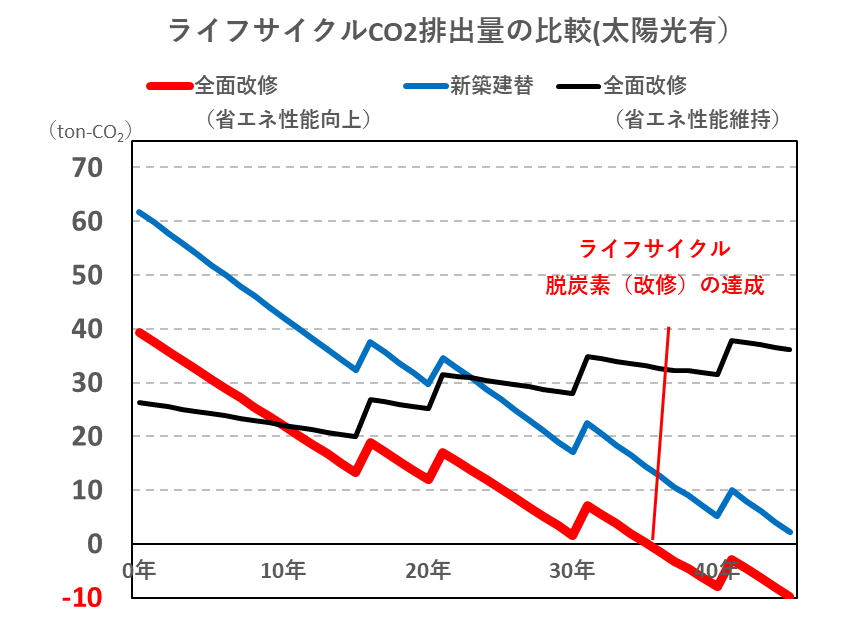 すべて統合すると、「全面改修(省エネ性能向上)」が3つの内、最も早くライフサイクル脱炭素を達成可能と確認できました。