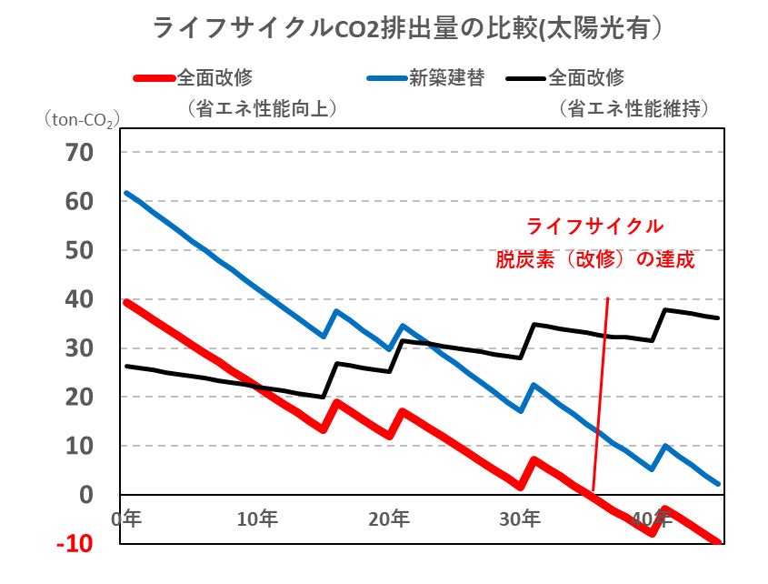 新築建替よりも省資源・省CO₂である住宅改修は、ライフサイクル脱炭素を新築よりも早く達成可能であることを証明