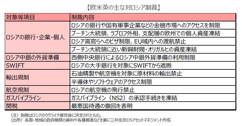 ■欧米を中心とする世界各国は、ロシアのウクライナ侵攻に至る前に、それを警戒していました。しかし、実際にウクライナ侵攻が開始されたことで、主要国は経済制裁を強めています。具体的には、ロシアの一部金融機関の国際銀行間通信協会(SWIFT)からの排除や、ロシア中央銀行の外貨準備の利用制限、プーチン大統領をはじめとする支配層の個人資産凍結といった金融面での経済制裁が挙げられます。