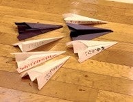 羽田空港第2ターミナルに飾られるデニム神輿の装飾と聞いて、ワクワクしました。伊勢和紙の手触りを楽しみながら、願いを込めて紙飛行機を折り翼に願いを書きました。こどもたちの願いは翼にのって大空に舞い上がることでしょう。すてきな体験をありがとうございました。
