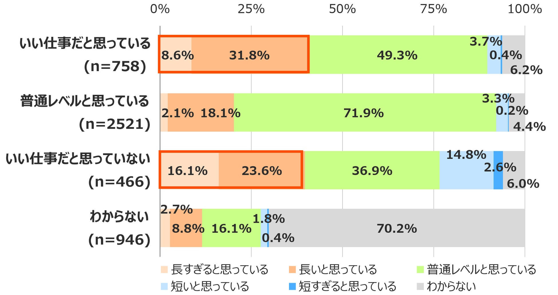 これらの結果を踏まえ、親の働く時間の長さと仕事に対する子どもからの評価をクロス分析したところ、子どもが働く時間を「長すぎると思っている」「長いと思っている」と回答した人は、子どもが自分の仕事を「いい仕事だと思っている」と回答した人にも、「いい仕事だと思っていない」と回答した人にも、合計約40%ずついる結果となりました(図表7)。このことから、親は、自分の子どもからの仕事の評価につながる要因が働く時間の長短だけではないと受けとめていることが示唆されました。