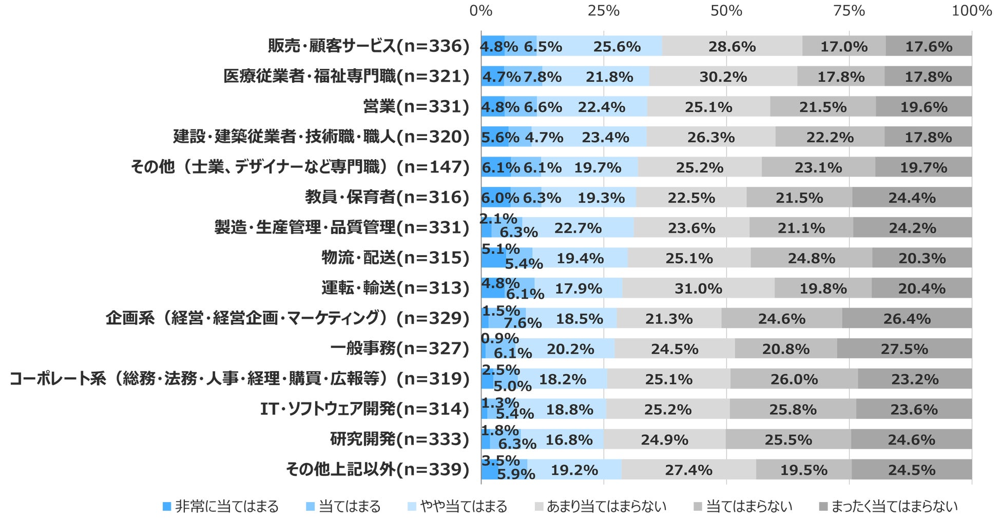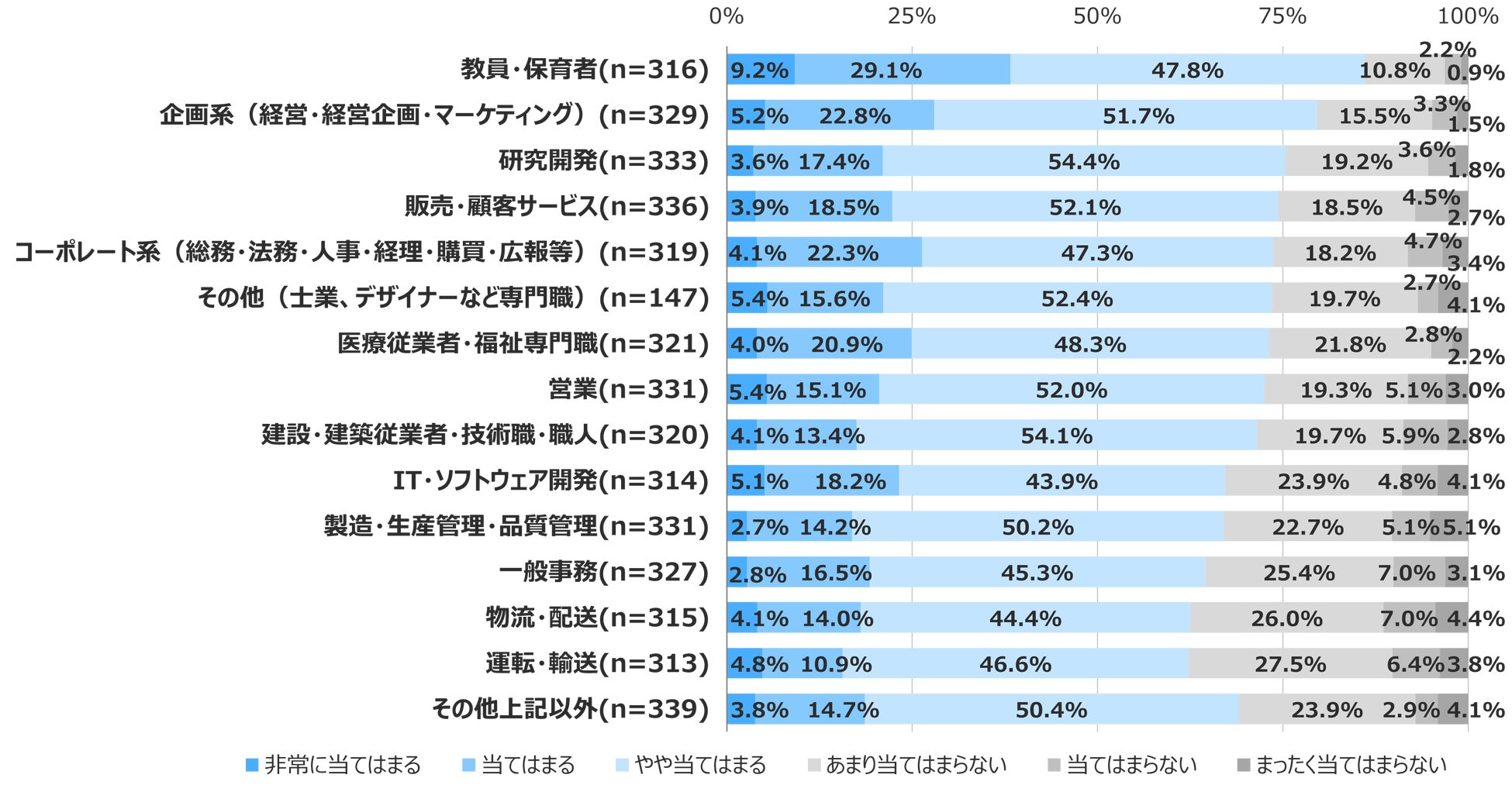 過去半年間の経験として、「子どもの生きる将来のために自分は役に立っていると思う」と回答した人(「非常に当てはまる」「当てはまる」「やや当てはまる」の合計)は、すべての職種で60%以上と高い傾向があり、子どもが10~18歳になっても、親として子どもと関わることの意義を感じていることが伺えました。一方、職種ごとに約62~86%のばらつきがみられ、業務内容などによってその意義の感じ方に差がある可能性が示唆されました(図表1)。