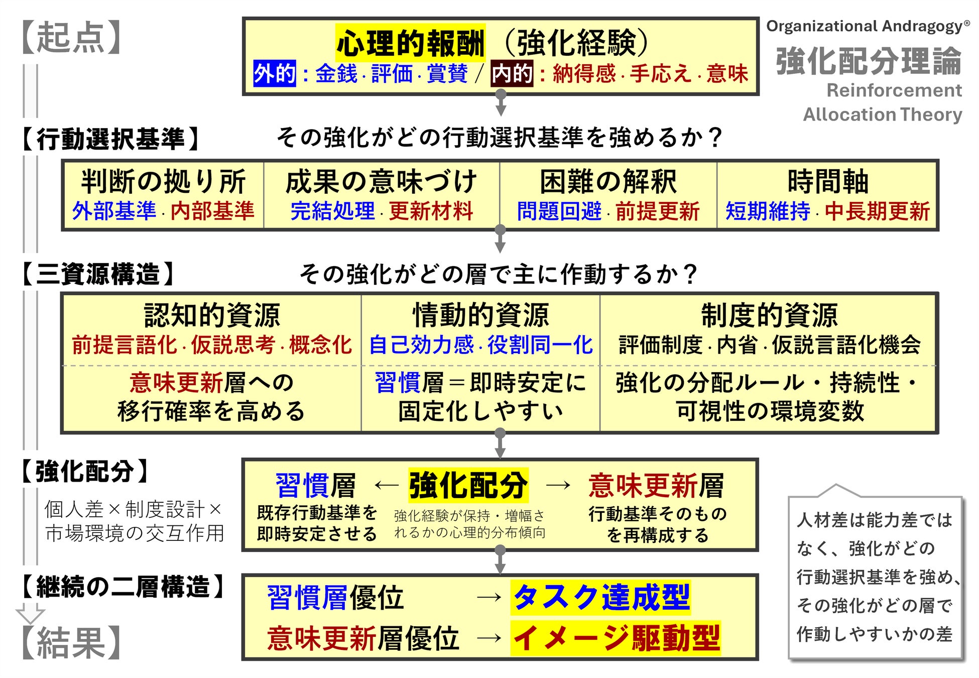 したがって、人材差とは能力の固定的な差ではなく、「強化がどの基準を強め、その強化がどの層で作動し続けているかの差」として生じるのです。