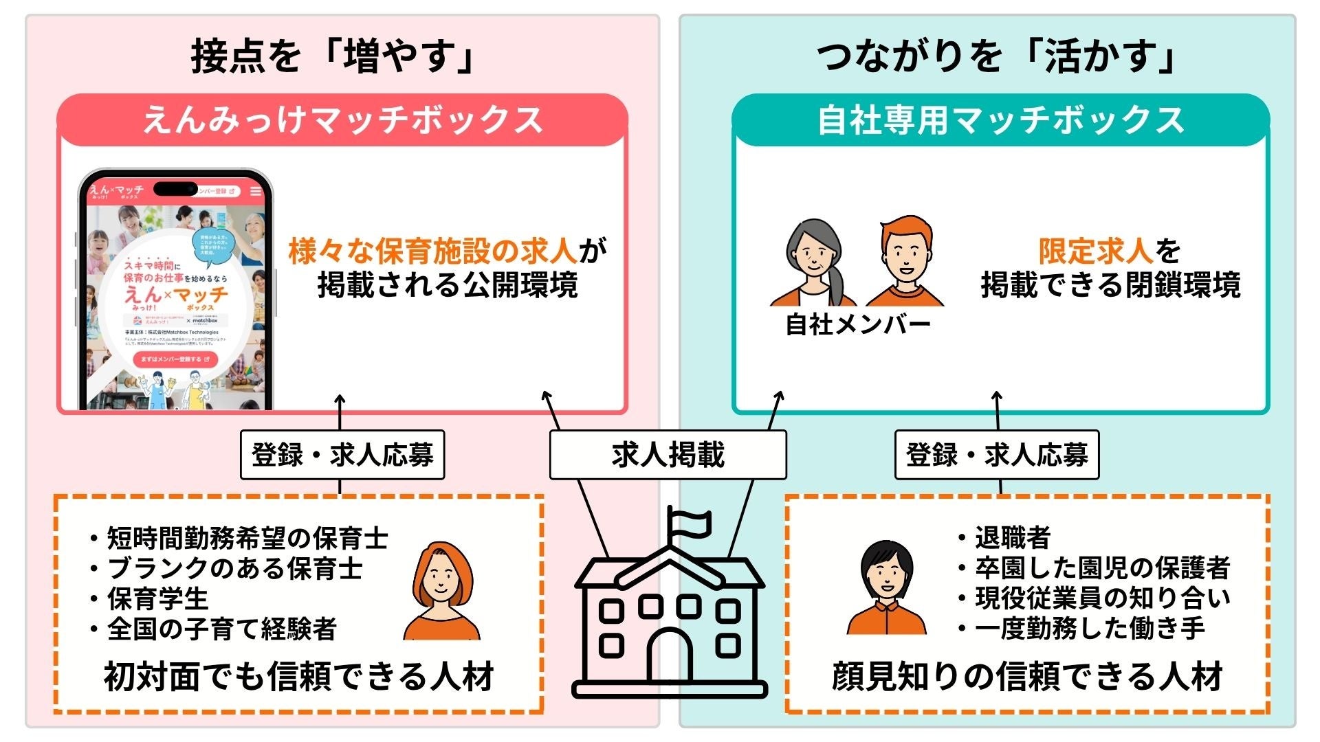当社とリンクは、こうした人材と保育施設との接点を広げることに加え、保育施設がこれまで築いてきた信頼できる保育人材とのつながりも活かしながら、施設ごとの状況に応じた人材活用を支援していくため、「えんみっけマッチボックス」を開始しました。