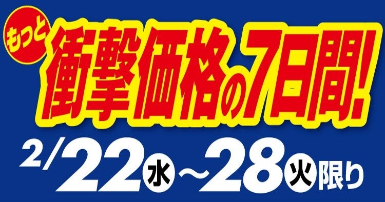 株式会社ベイシア(本社:群馬県前橋市、代表取締役社長:相木孝仁)は、2月22日(水)から2月28日(火)の期間で、“衝撃価格”と題して大変お得なセールを開催いたします。日頃よりベイシアをご愛顧いただいている皆様へ感謝を込めたセール第二弾です。このお得な機会をぜひお見逃しなく!