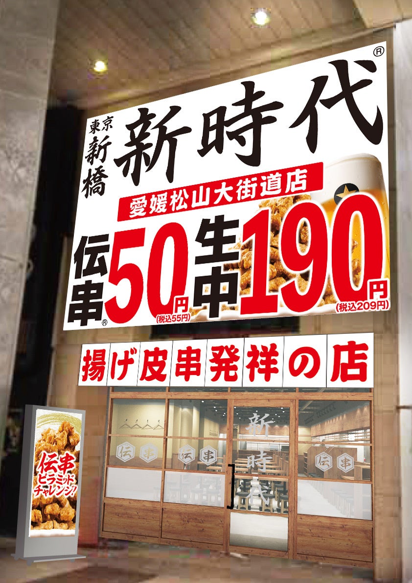 新時代は「揚げ皮串発祥」のお店であり、名物の『伝串』は、特許庁から認められる唯一無二の大ヒット商品です。そこで、お並び頂いても体験されたいというお客様が多く、連日行列ができる人気の居酒屋です。1000の街を元気にするため、全国の街を一つずつ元気にしており、ついに四国初上陸!今回は四国を元気にします!大行列ができること間違いなしです。