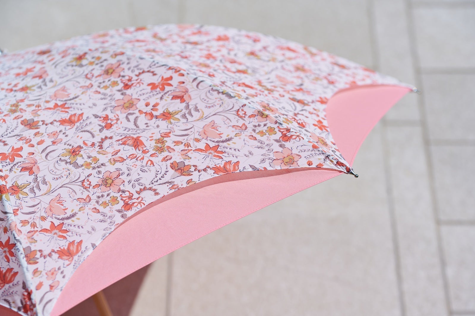 「かわず張り」は傘の内側にも生地を張った二重のデザインが特徴で、「蛙の手」に似ていることからその名が付けられた製法です。傘の骨が隠れているので、「髪の毛が引っかかって痛い」というお悩みを解消できます。表地に絶妙に透けて見える裏生地の柄との組み合わせが楽しめるだけでなく、二重に張られた生地と生地の間に空間ができるため、太陽の光が伝わりにくく、空間にたまった熱気を逃がす効果があります。