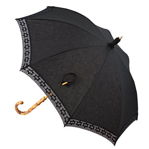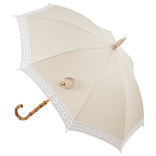 「トーションレース」はイタリアのトーション地方で生まれた、服の袖や襟の飾りなどによく使われる細幅で粗い網目模様のレース生地です。綿麻生地の傘本体のまわりに縫い合わせて繊細なデザインに仕上げています。レースからこぼれる陽の光が、肌を綺麗に、顔をより美しく見せます。
