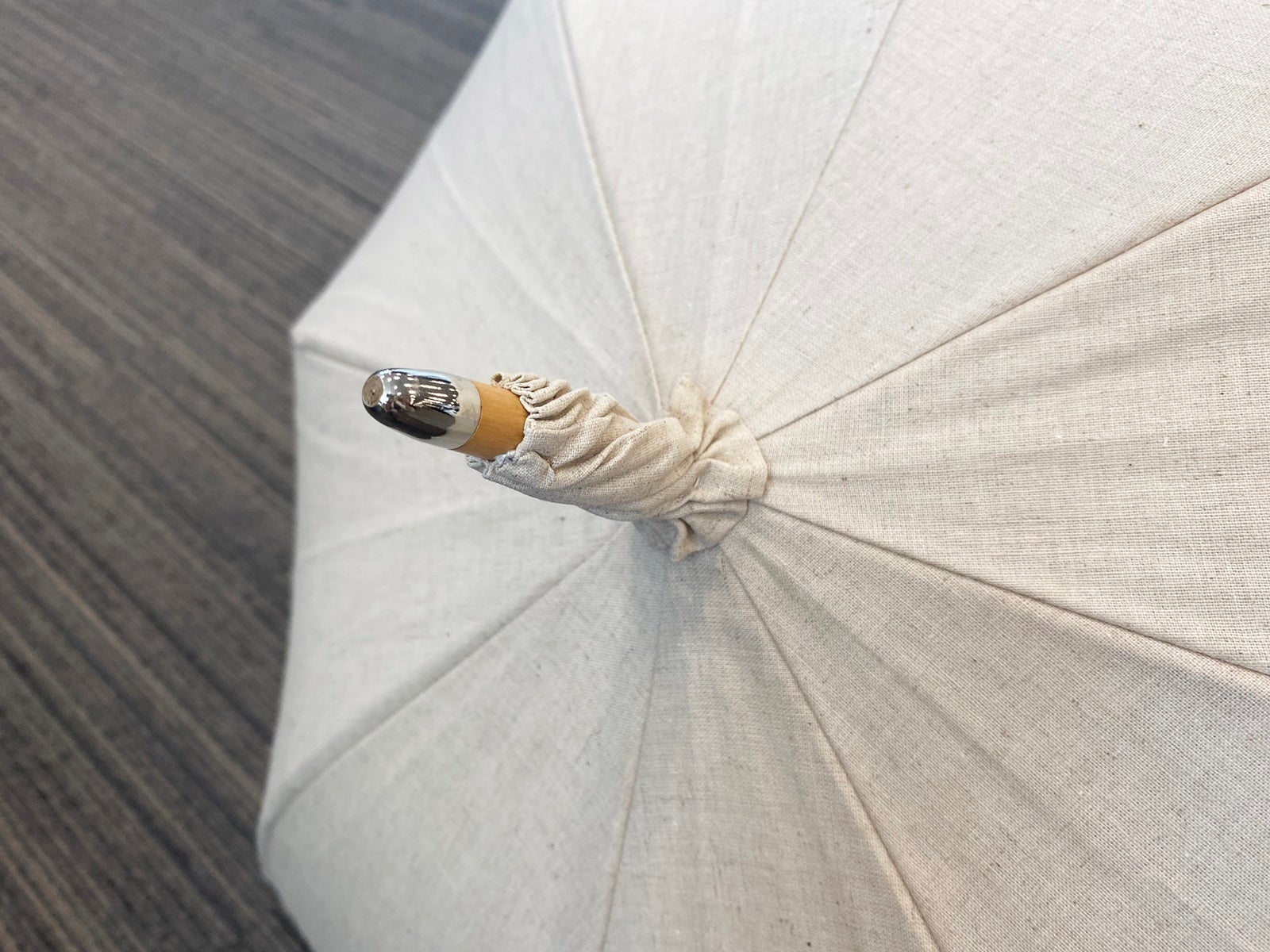 中棒に白木、ハンドル部分は寒竹や楓を使用し高級感のある見た目・質感に仕上げています。天然素材の生地の重みをバランスよく支えられるよう親骨には鉄を使用しています。