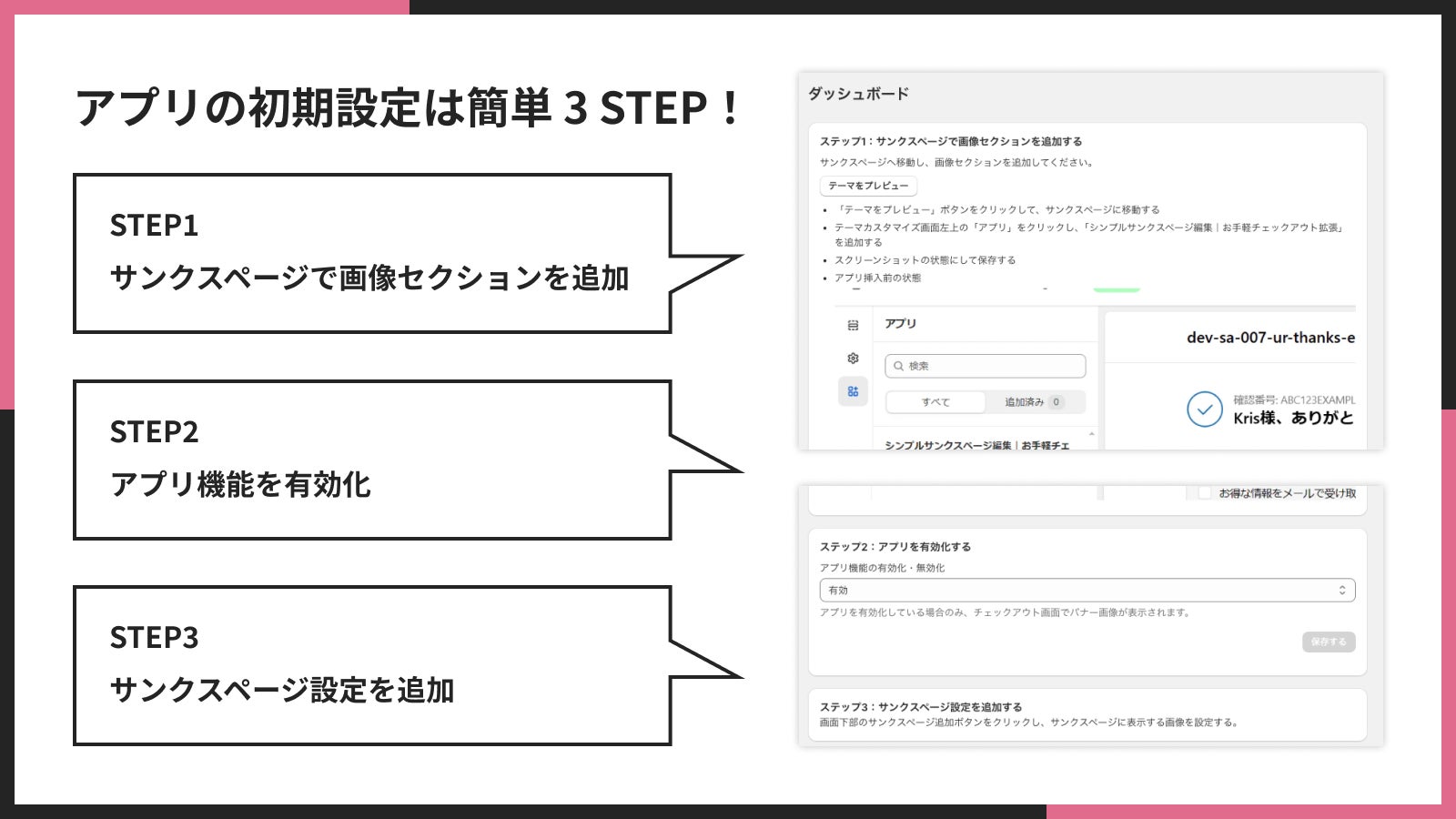 「シンプルサンクスページ編集|お手軽チェックアウト拡張」では、簡単な3STEP でアプリの設定が完了します。また、より詳しい設定方法を記載している、ご利用ガイドもあるため、初心者の方でも安心して利用できます。