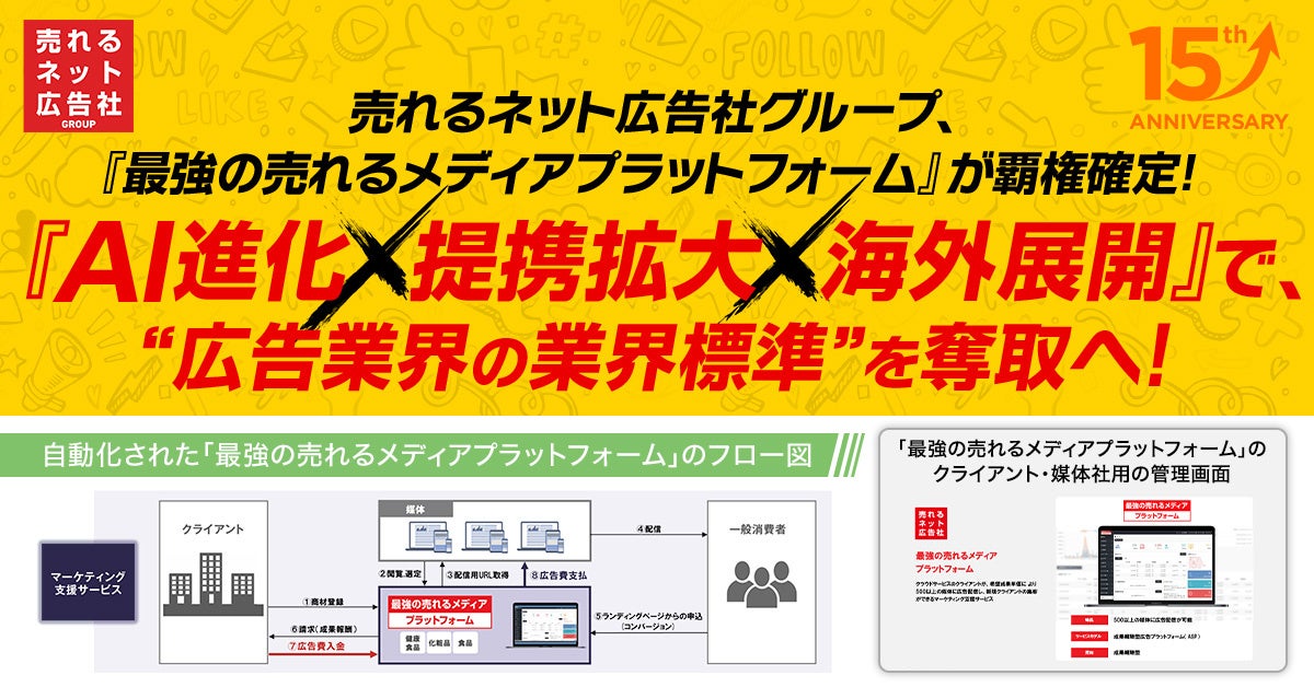 提供開始から“15周年”を迎えた本プラットフォームは、いまや“広告業界の覇権”を確定させつつあり、「AI進化×提携拡大×海外展開」の三位一体による爆発的な進化が、その動きをさらに加速させています。