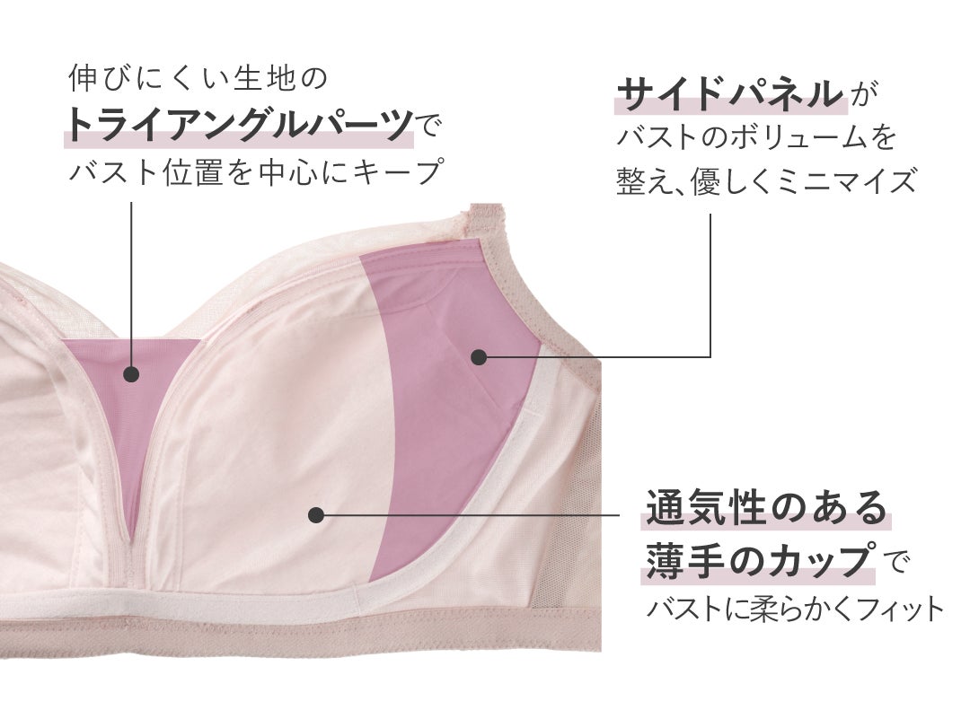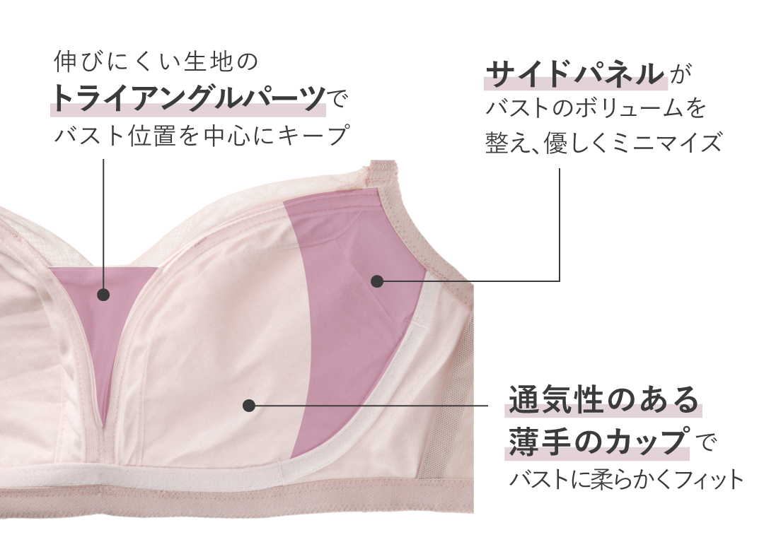 カップ両サイドに施したサポートパネルと、カップ中心に配した伸びにくい生地のトライアングルパーツにより、バストの高さを上に逃がし、横広がりを抑えてサイズダウン。