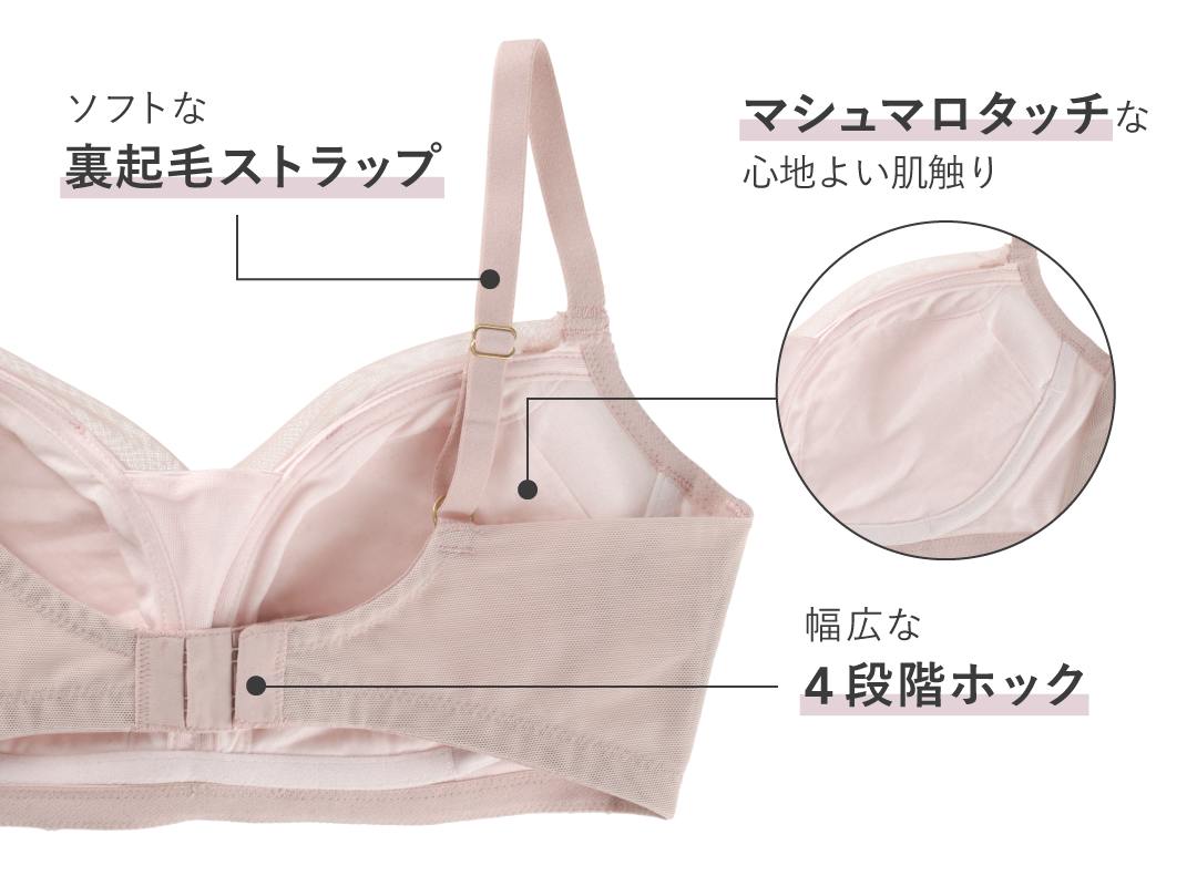 カップ肌側はマシュマロタッチな肌触りで、バストに心地よくフィットします。