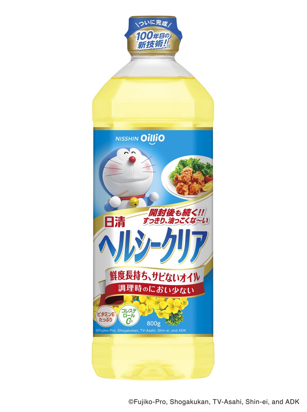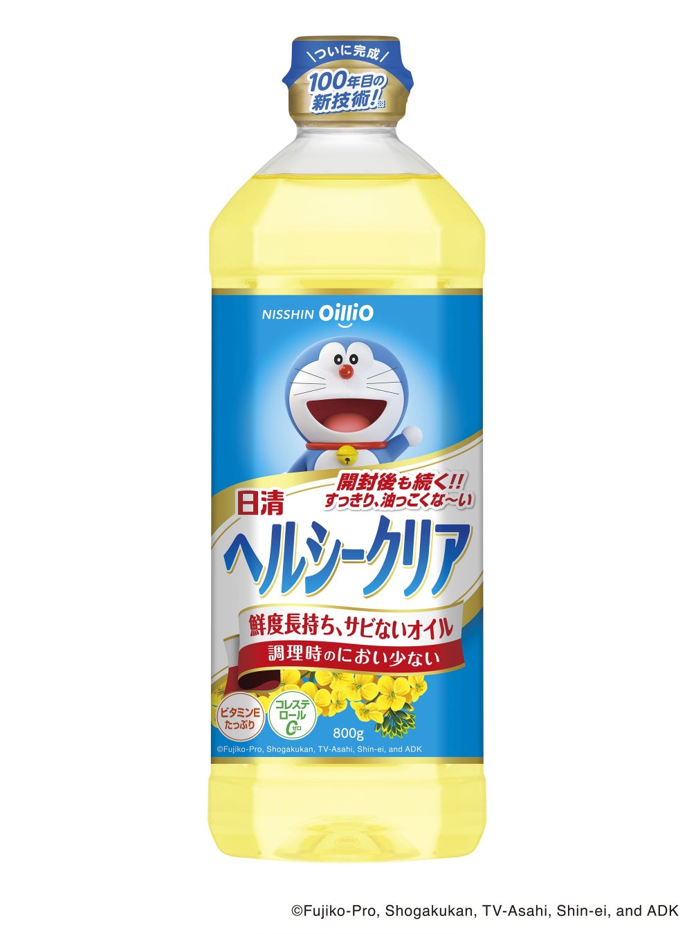 国民的キャラクターとして幅広い層から愛され、「日清ヘルシークリア」のTVCMにも出演している「ドラえもん」をデザイン。「酸化」を抑制する新技術「ウルトラ酸化バリア製法」によって、開封後も鮮度が長持ちする食用油「日清ヘルシークリア」を毎日使う楽しさを演出します。