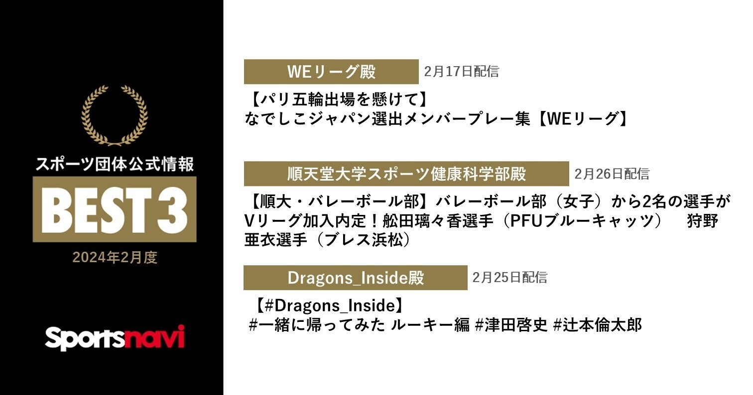 WEリーグ、順天堂大学スポーツ健康科学部、Dragons_Inside(中日ドラゴンズ)が受賞! スポーツ団体公式情報月間ベスト3(2024年2月度)