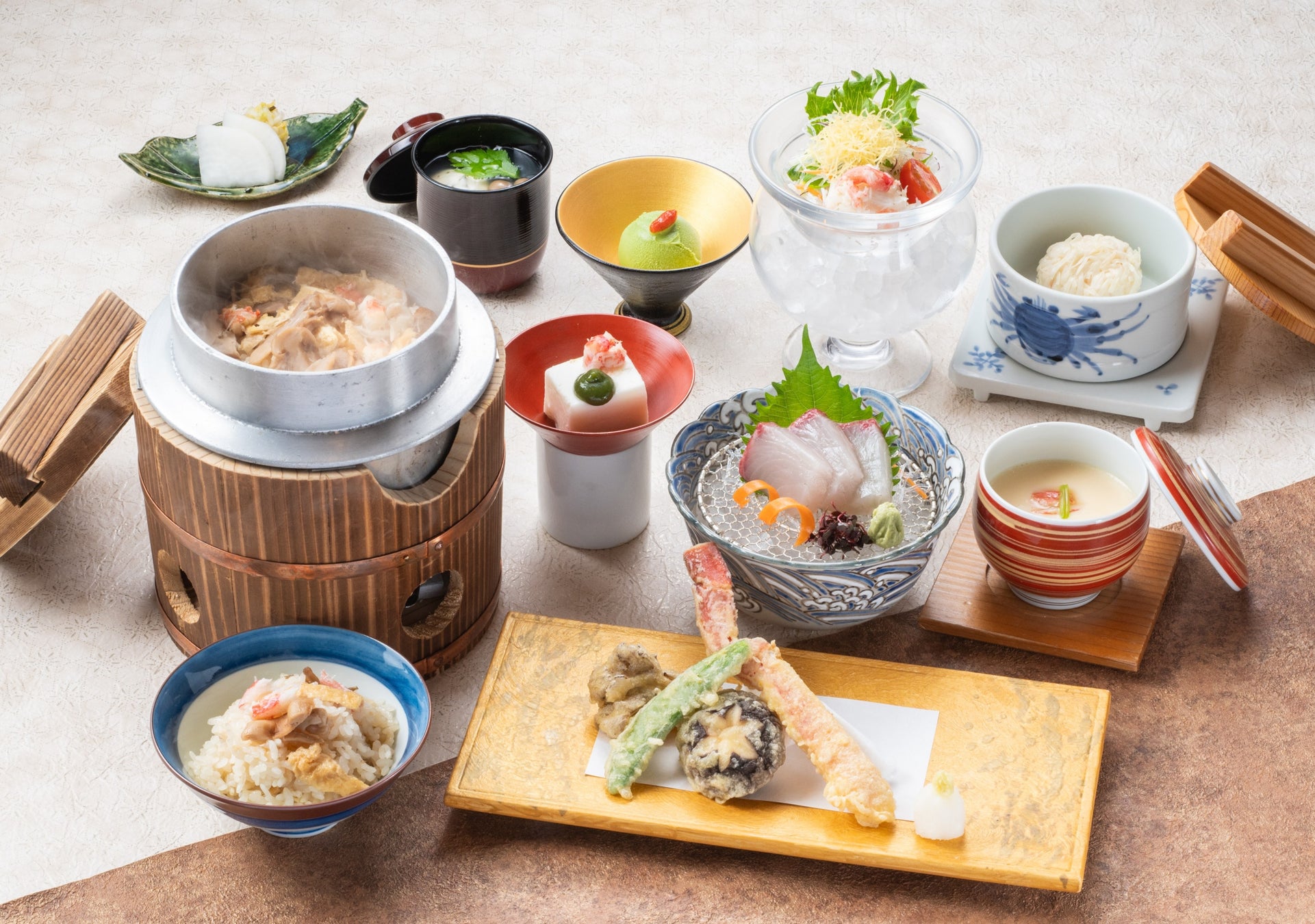 松茸とずわいがにの天婦羅や七輪焼など、秋の旬とかにを堪能できる期間限定のコース・ランチ・単品が勢揃い