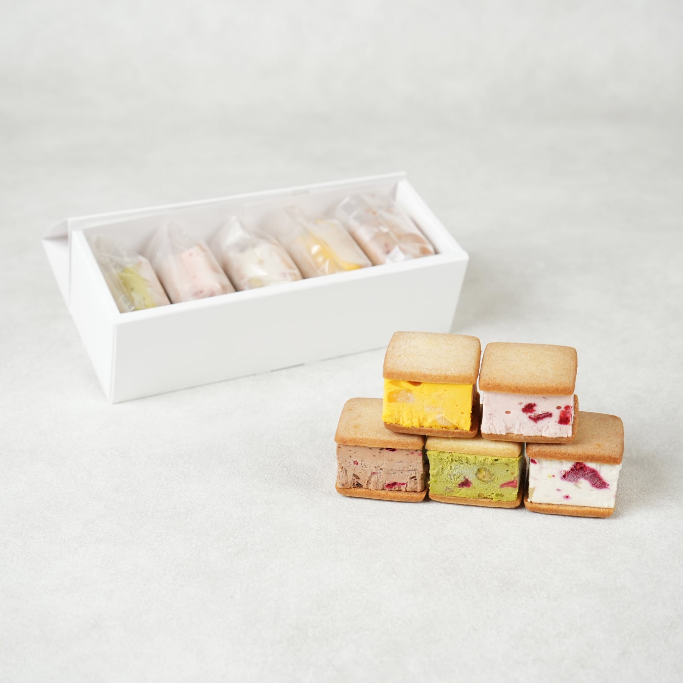 カッサータサンドとは、カッサータを食べやすいサイズにカットし、アーモンドたっぷりのサブレで挟んだ片手で食べられるスイーツです。ポップアップストアでは、お客様のお好きなカッサータサンドを5つセレクトし、店頭スタッフが箱にお詰めするオリジナルボックスをご用意。フレーバーはプレーン・ストロベリー・チョコ・ピスタチオ・マンゴーの5種類の中から、お選びいただけます。