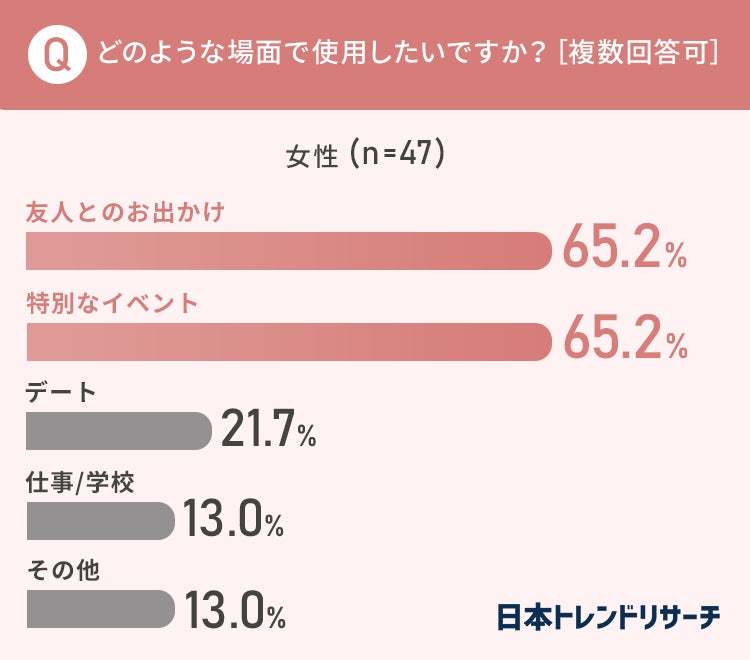 | 友人とのお出かけ | 友達と遊びに行く時にすれば化粧と合わさってとても可愛く見えるという理由です(10代・女性) |