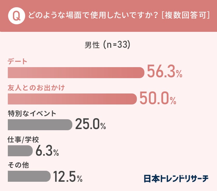 女性は65.2%の「友人とのお出かけ」「特別なイベント」が、男性は56.3%の「デート」がもっとも多い結果になりました。
