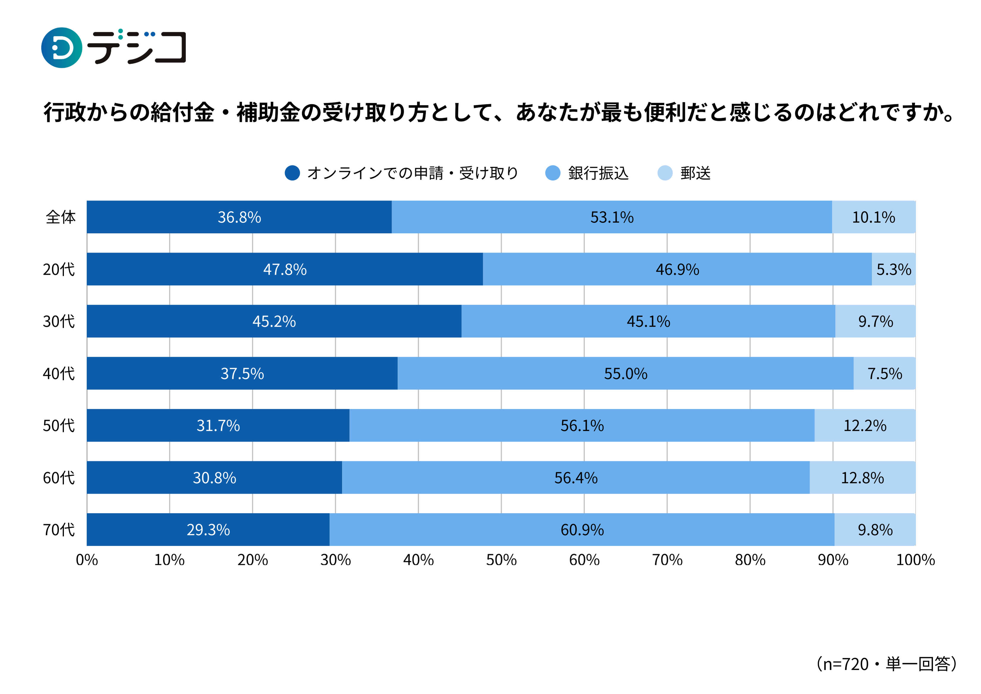 世代別で見ると、20代と30代では、「オンラインでの申請・受け取り」が「銀行振込」とほぼ同等の割合で最も便利だと回答されており、若年層のデジタル受給への高いニーズが明確になりました。