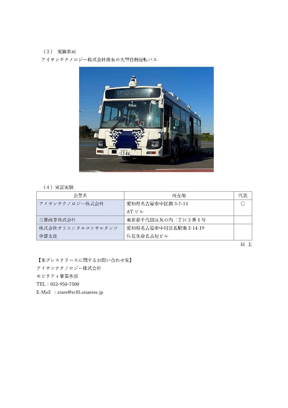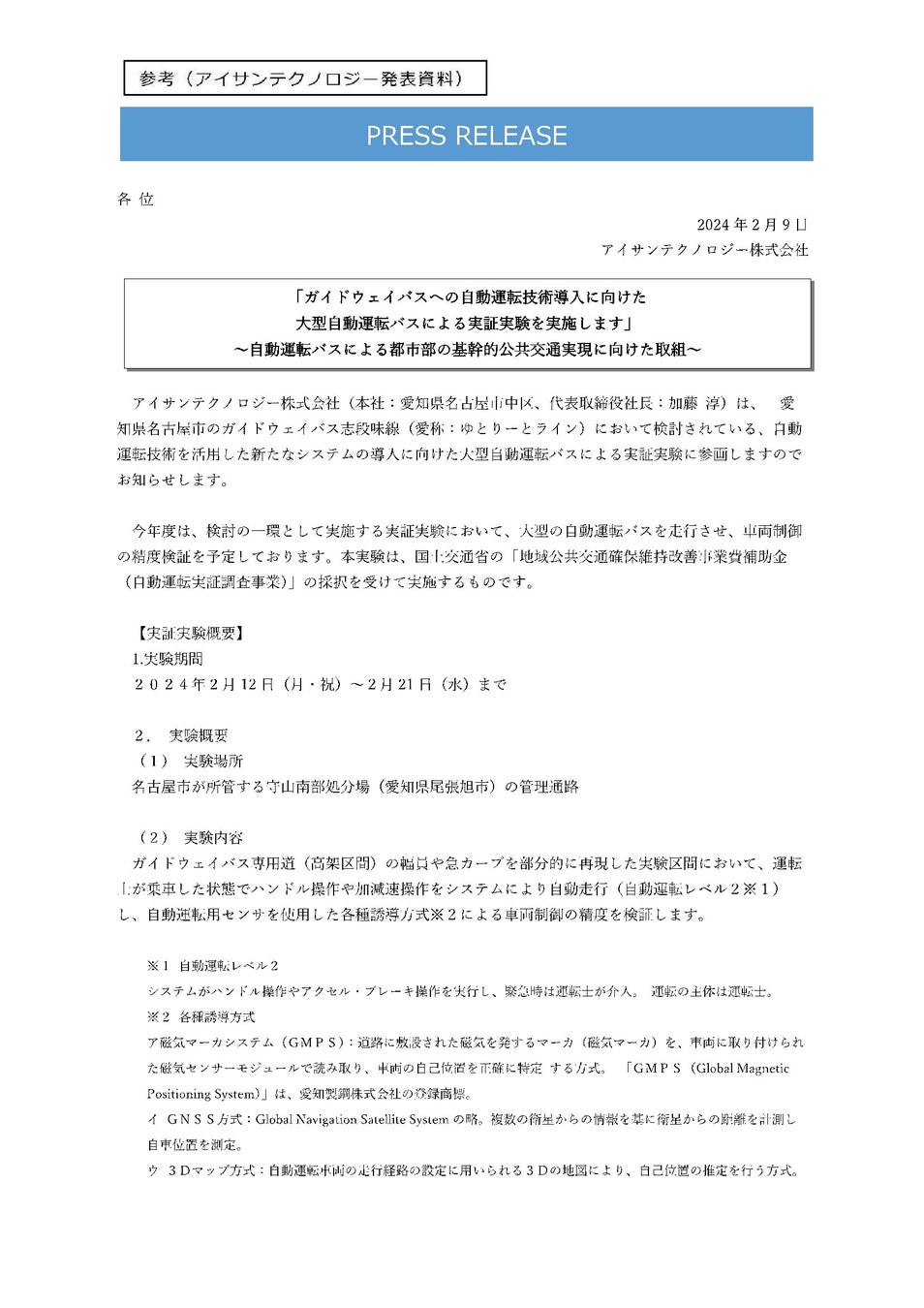 (実証実験の概要は、参考(アイサンテクノロジー発表資料)『「ガイドウェイバスへの自動運転技術導入に向けた大型自動運転バスによる実証実験を実施します」~自動運転バスによる都市部の基幹的公共交通実現に向けた取組~』をご参照ください。)