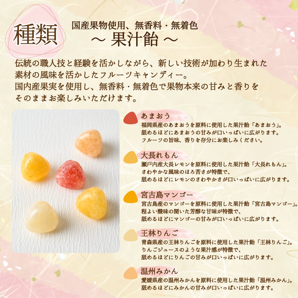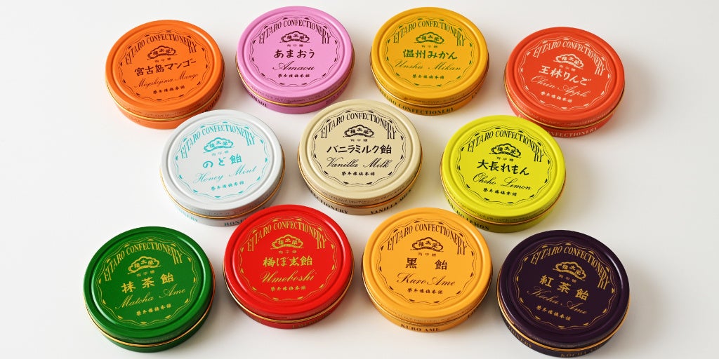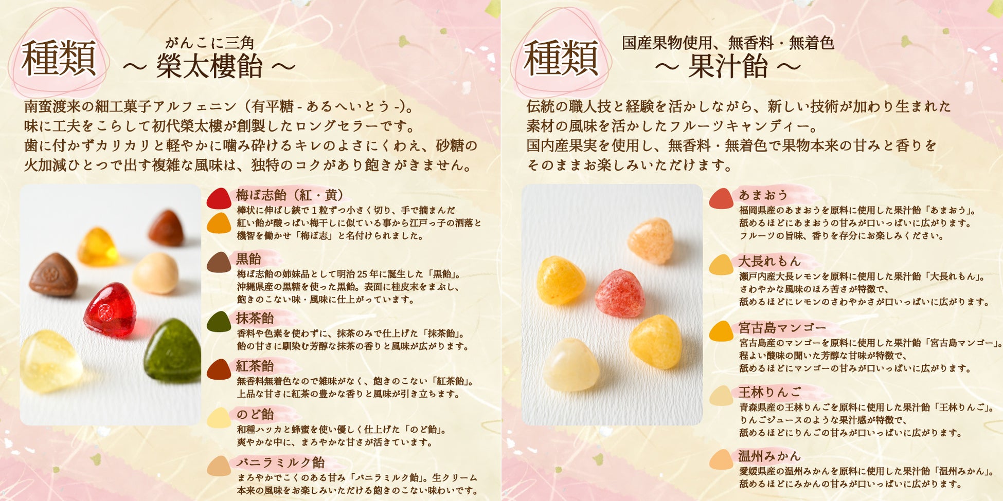 梅ぼ志飴(紅・黄)、黒飴、抹茶飴、紅茶飴、のど飴、バニラミルク飴、あまおう、大長れもん、宮古島マンゴー、王林りんご、温州みかん