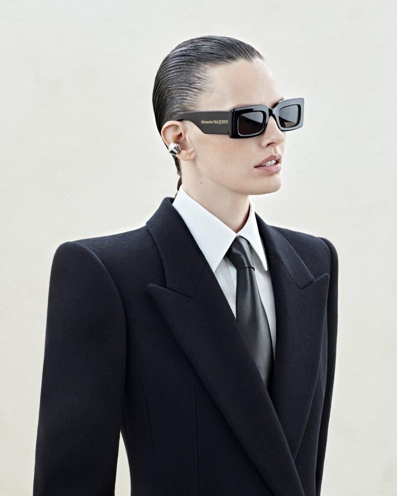 特徴的なテンプルにレクタンギュラーシルエットが、アレキサンダー・マックイーンらしい洗練された力強さを感じさせます。