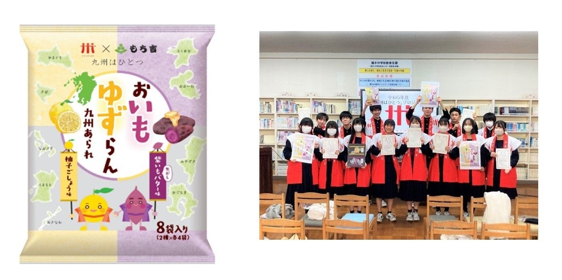 NEXCO西日本グループは、九州・山口各県と経済団体で構成する九州地域戦略会議の理念「九州はひとつ」に賛同し、福岡県、株式会社もち吉(福岡県直方市)、直方市立植木中学校と協働し”九州はひとつ”プロジェクトの商品開発を行いました。生徒が考案した全68件のアイデアの中からレシピ、ネーミングなどを選定し、今回の販売商品が完成しました。