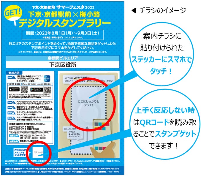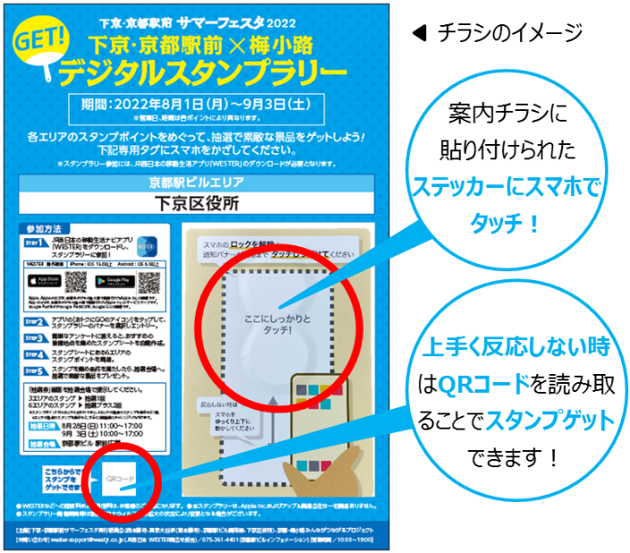 条件②下京エリア内のラリーポイントにて、キャンペーンチラシ上のステッカーにスマホをかざしてスタンプをゲット!!
