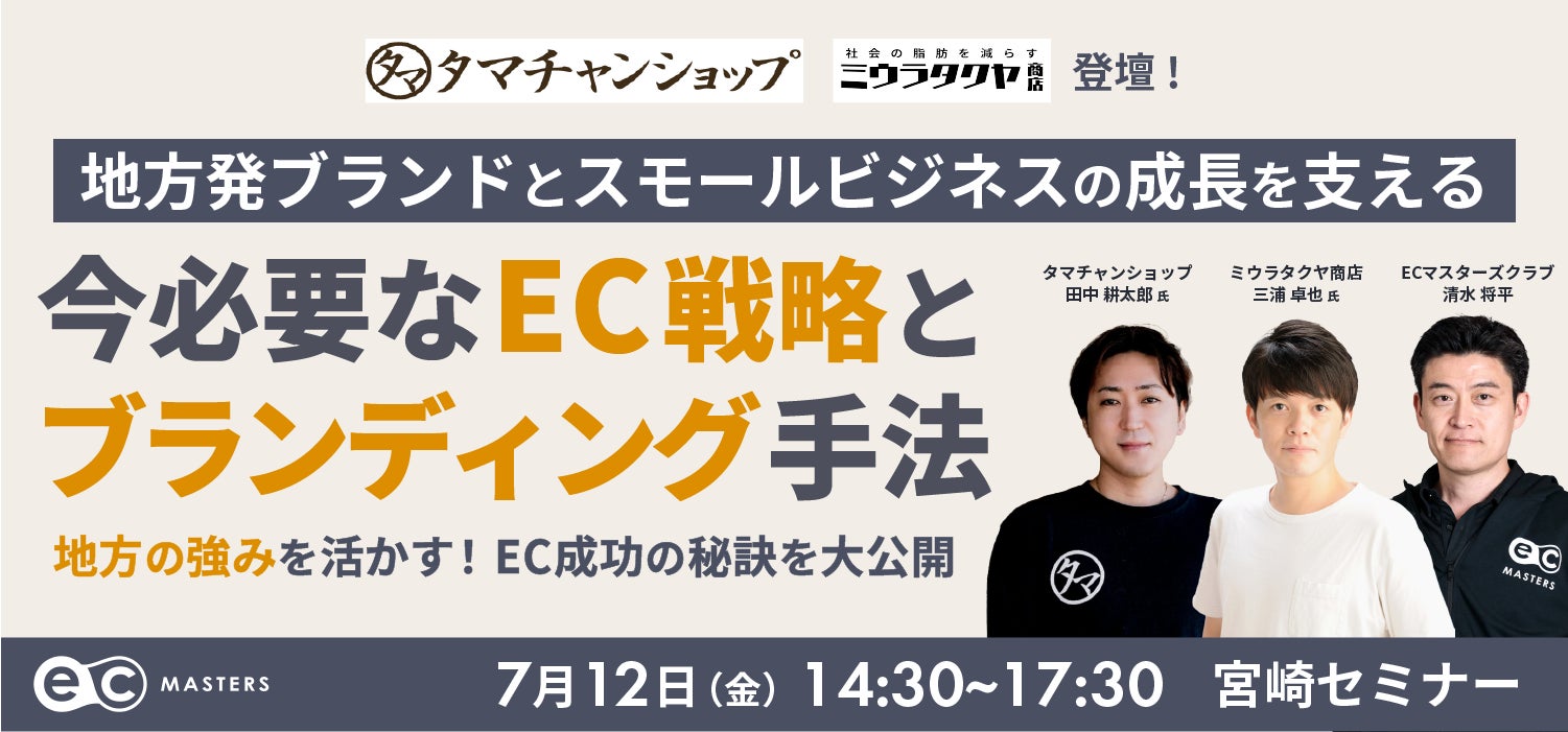 日本全国の楽天ショップ約2,600社が所属する「ECマスターズクラブ」を運営する日本ECサービス株式会社(本社:東京都渋谷区、代表取締役:清水将平)は、全国的な知名度を誇る「タマチャンショップ」店長の田中 耕太郎氏と、ユニークなダイエット食品で話題の「ミウラタクヤ商店」店長の三浦 卓也氏の2名をお招きし、今必要なEC戦略とブランディング手法をテーマに2024年7月12日(金)に宮崎でセミナーを開催します。