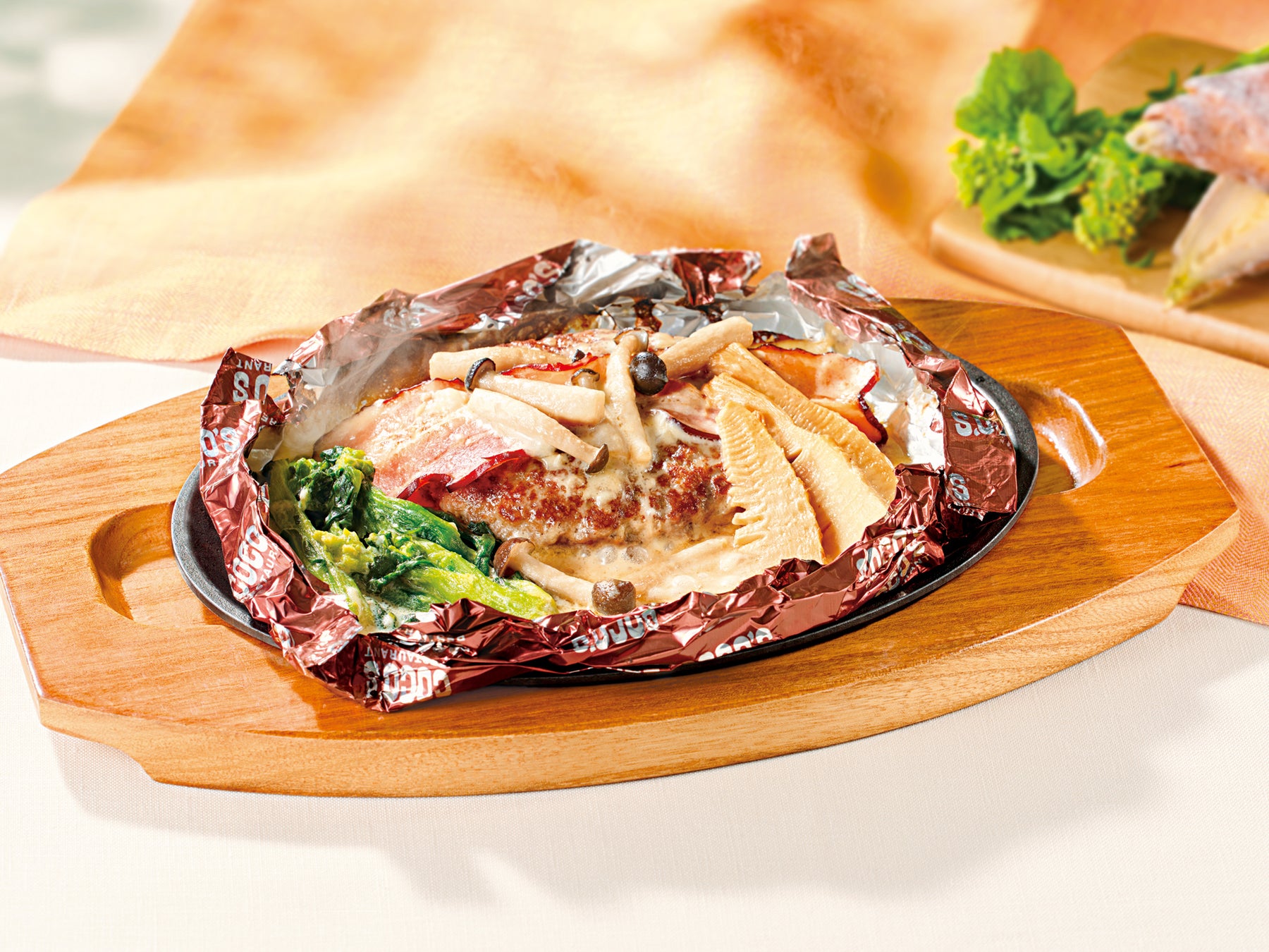 ココス定番の包み焼きハンバーグを旬の菜の花と筍(たけのこ)で季節のひとさらに仕上げました。