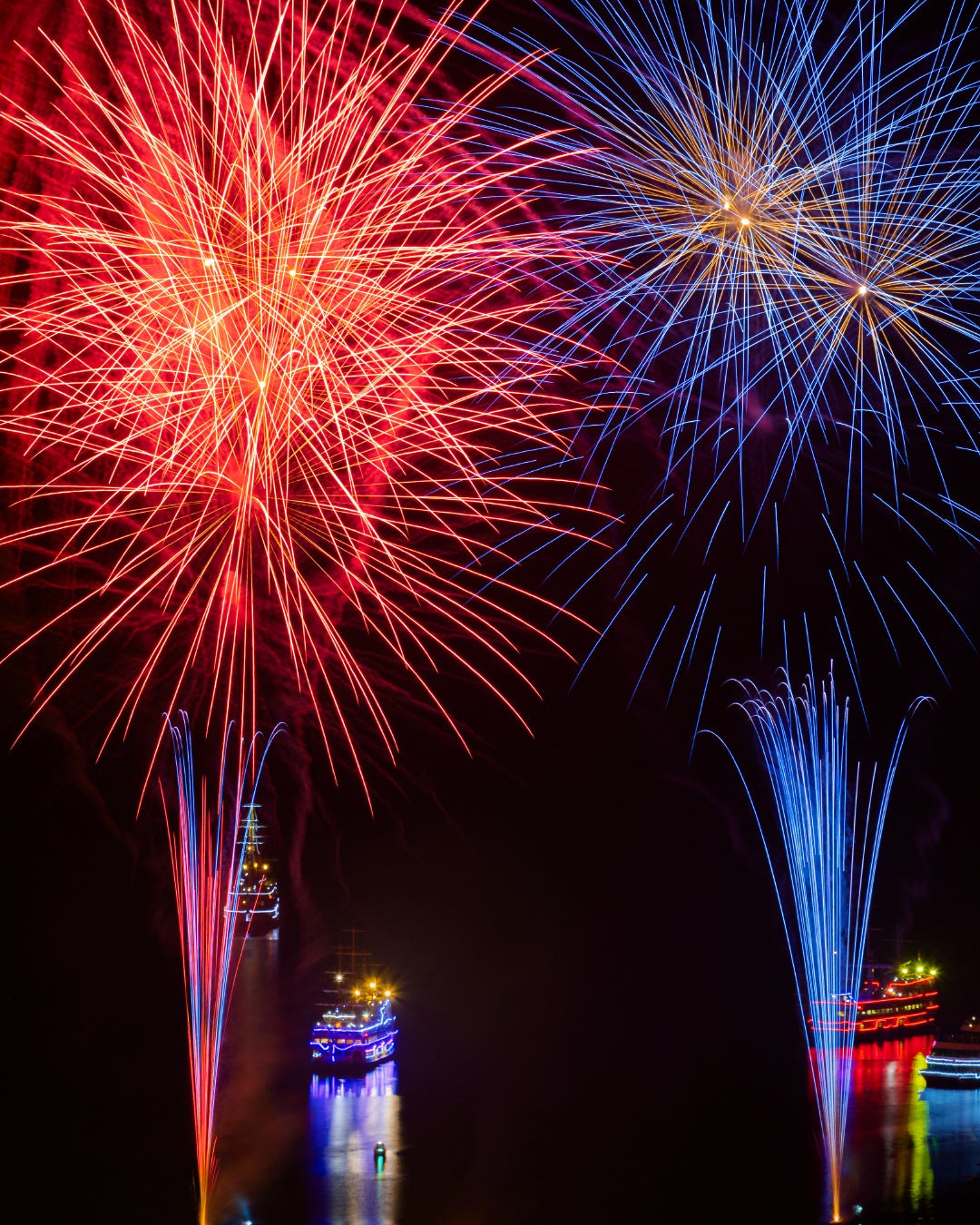 箱根海賊船から楽しむ「花火観覧クルーズ」(有料)は、音楽に合わせて湖上に打ちあがる水中花火などに包まれる大迫力の新体験です。また、元箱根港付近の陸上では美しい花火とライトアップされた海賊船が幻想的に映し出される芦ノ湖の情景をお楽しみいただけます。