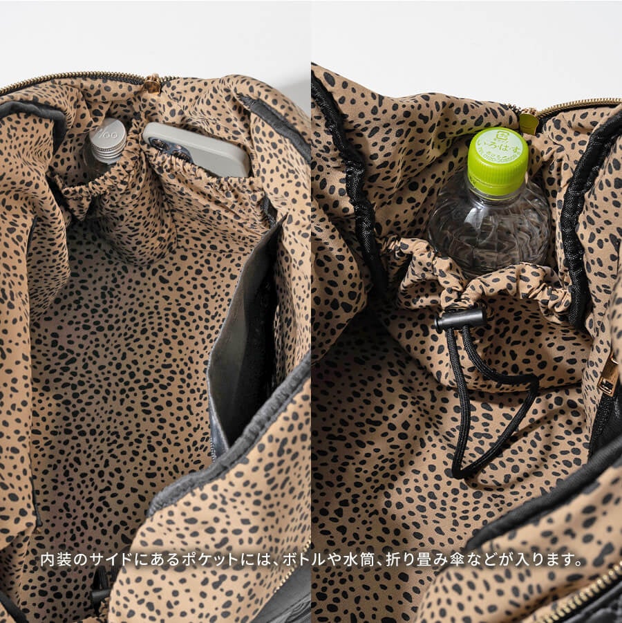 【メイン内装ポケット】オープンポケットx3(内1つは絞ることが可能)、ファスナーポケットx2(メッシュ)
