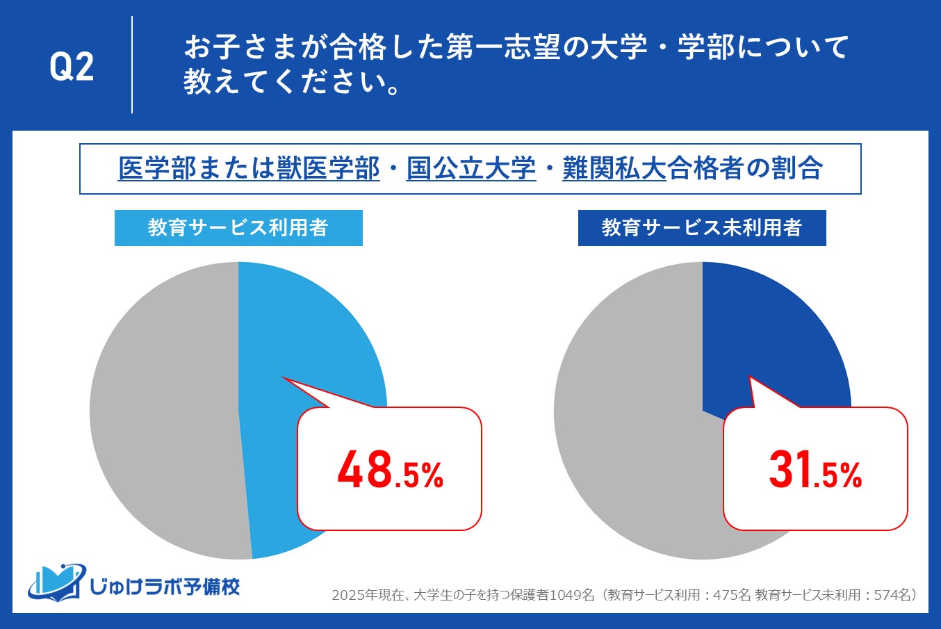 じゅけラボ予備校(所在地:大阪市北区、代表取締役:後藤智則)はこの度、現在大学生のお子様を持つ保護者1049名を対象に、大学受験における教育サービスの利用実態と合格した大学に関する調査を実施いたしました。