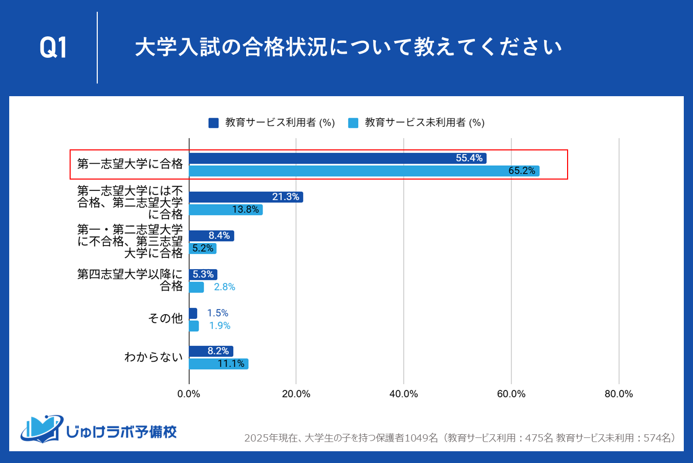 この数字だけを見ると、教育サービスの利用が必ずしも第一志望合格に直結するわけではない、という意外な可能性が示唆されます。しかし、この背景には、受験生がどの大学を「第一志望」として設定しているかという、より本質的な違いが隠されていました。