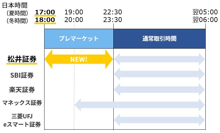 米国株市場の立会時間は、通常日本時間22:30~5:00(夏時間、冬時間は23:30〜6:00)となりますが、時間外取引であるプレマーケットを活用することで、立会時間前の日本時間17:00~22:30(夏時間、冬時間は18:00〜23:30)に取引ができるようになります。