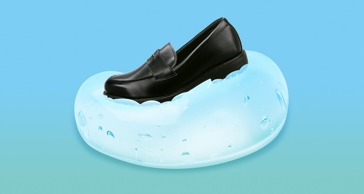 今回のシューズはクッション性以外にも、軽量性に優れ、雨で濡れた路面などでも安定性を感じられるグリップ力が特長です。さらに、表革には梅雨の時期や突然の雨にも安心な撥水加工を施しています。