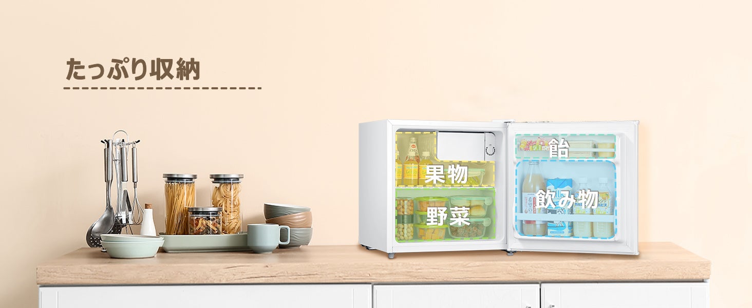 仕切り棚とドアポケット付きで、食品や飲み物をすっきり整理整頓。コンパクトながらも容量たっぷりで、デッドスペースを無駄にせず、効率よく収納できます。調味料やペットボトル、小物類までしっかり収まり、毎日の使いやすさをサポートする、機能豊富な冷蔵庫です。