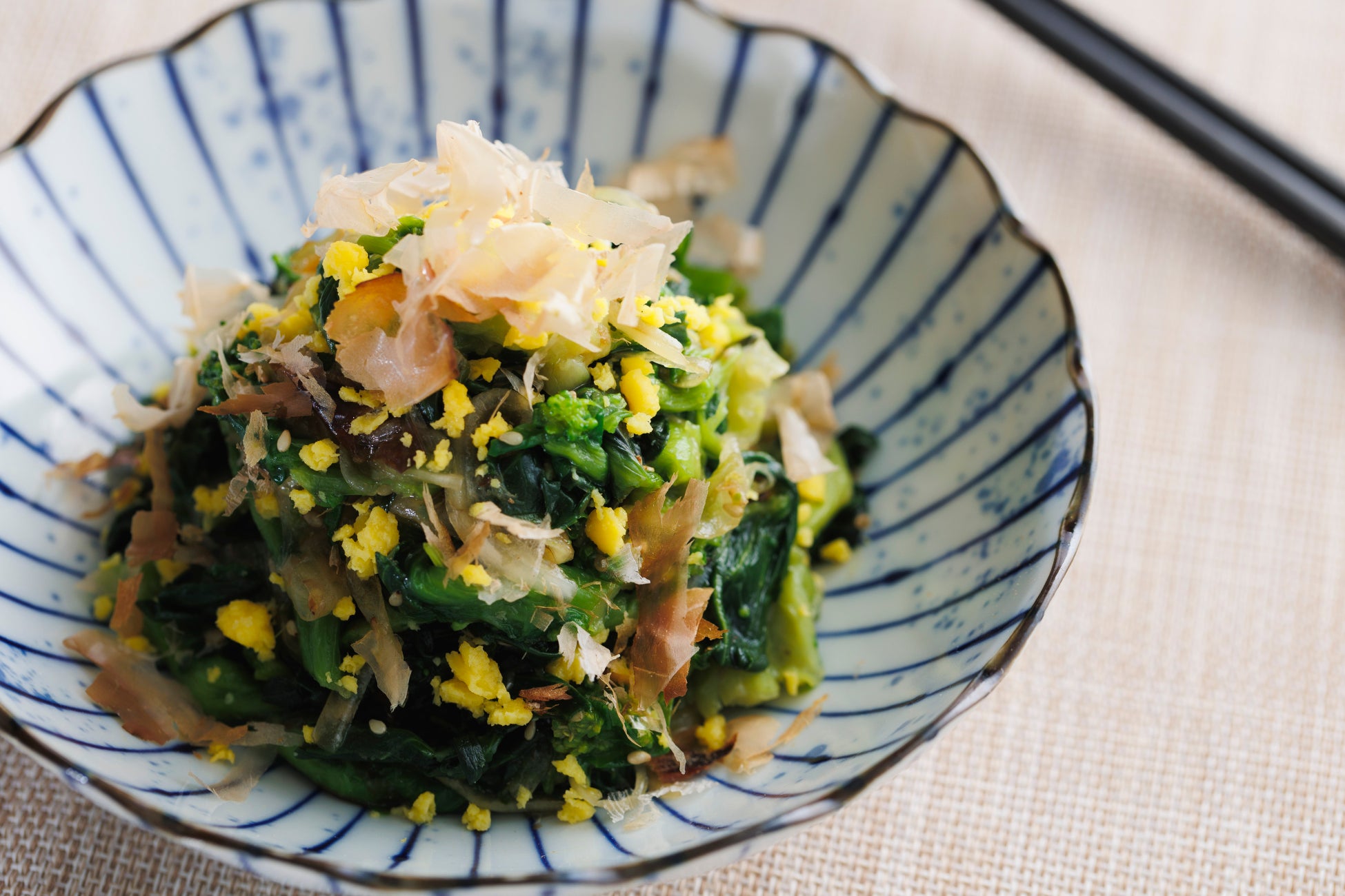 『春を味わう 菜の花のおかか和え』は、ほろ苦い菜の花を主役に、甘辛いたまねぎしょうゆだれで味付けし、かつお節と和えました。また、ほんのり甘いそぼろ卵をトッピングすることで、味わいにアクセントを加えました。そぼろ卵の鮮やかな黄色が菜の花のつぼみを連想させ、見た目からも春の訪れを感じられる一品です。