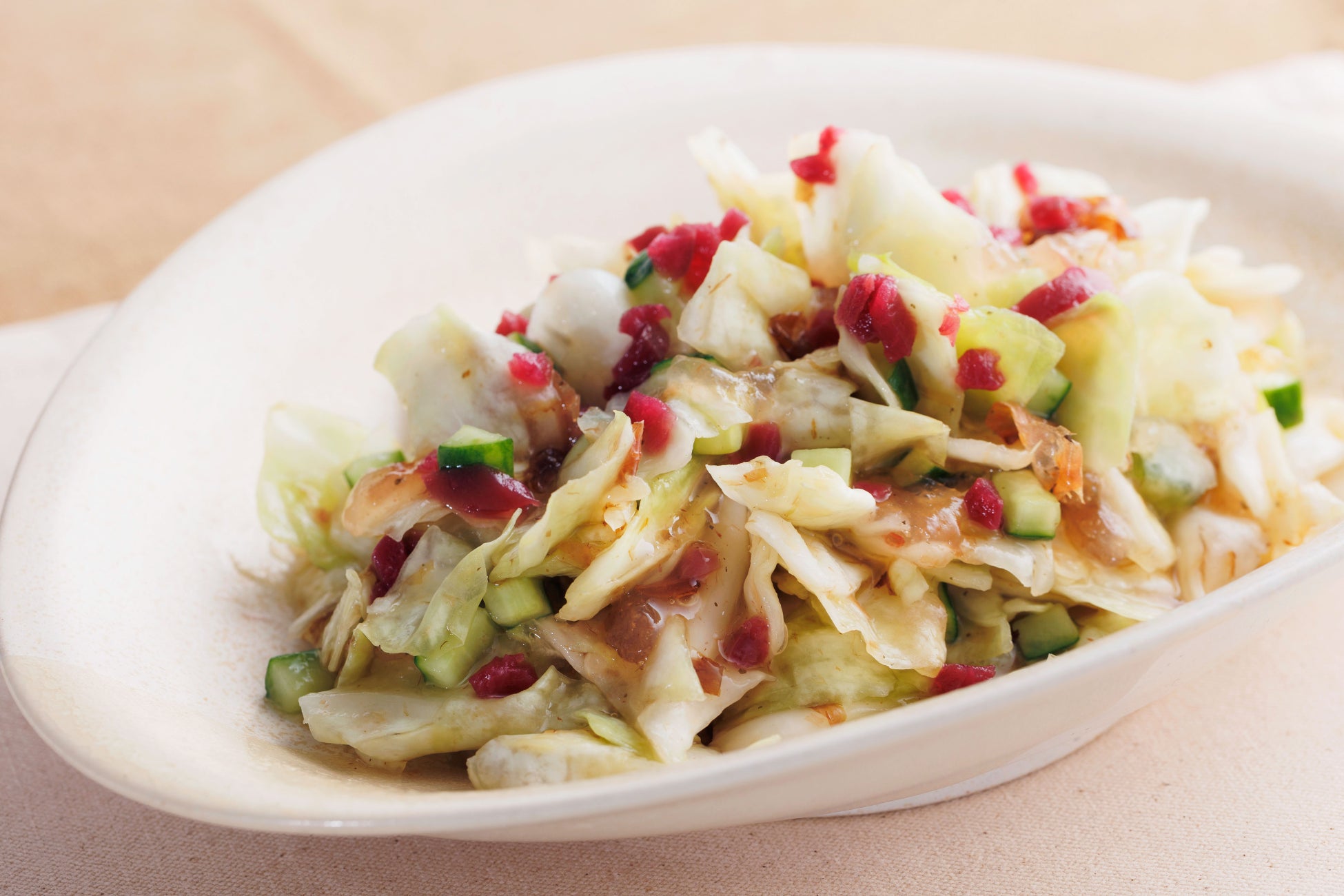 みずみずしくやわらかな春キャベツを梅ジュレとカリカリ梅、かつお節で味わう春の和サラダです。酸味の中にも、しょうゆやかつお節の旨味が感じられる、さっぱりとした味わいに仕上げました。