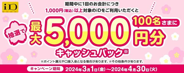 株式会社NTTドコモ(以下、ドコモ)は、「最大5,000円分をキャッシュバック!春のiDご利用キャンペーン」(以下、本キャンペーン)を、2024年3月1日(金)から2024年4月30日(火)まで開催いたします。