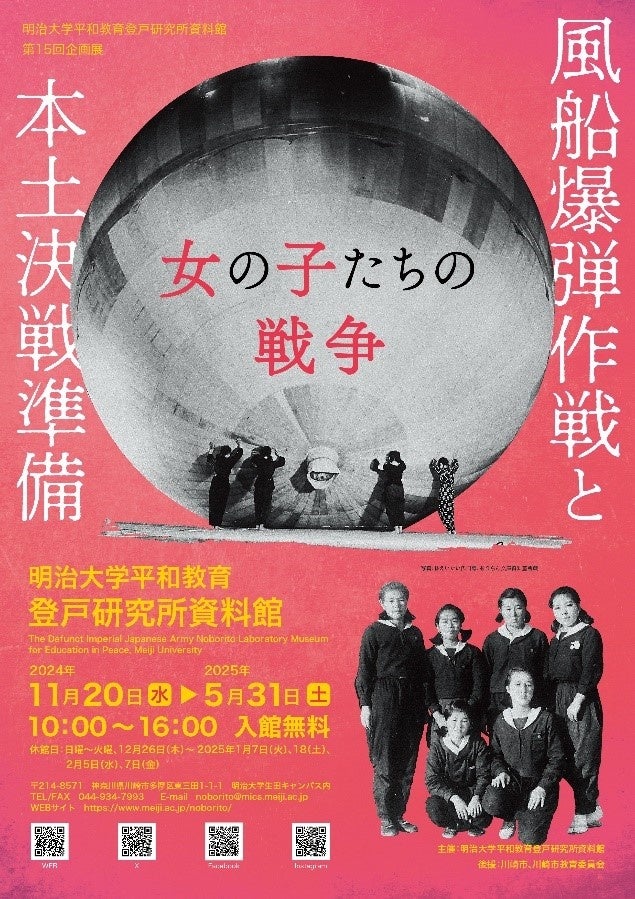 明治大学平和教育登戸研究所資料館は、2024年11月20日(水)から2025年5月31日(土)までの期間で第15回企画展「風船爆弾作戦と本土決戦準備 —女の子たちの戦争—」を開催します。入館は無料です。