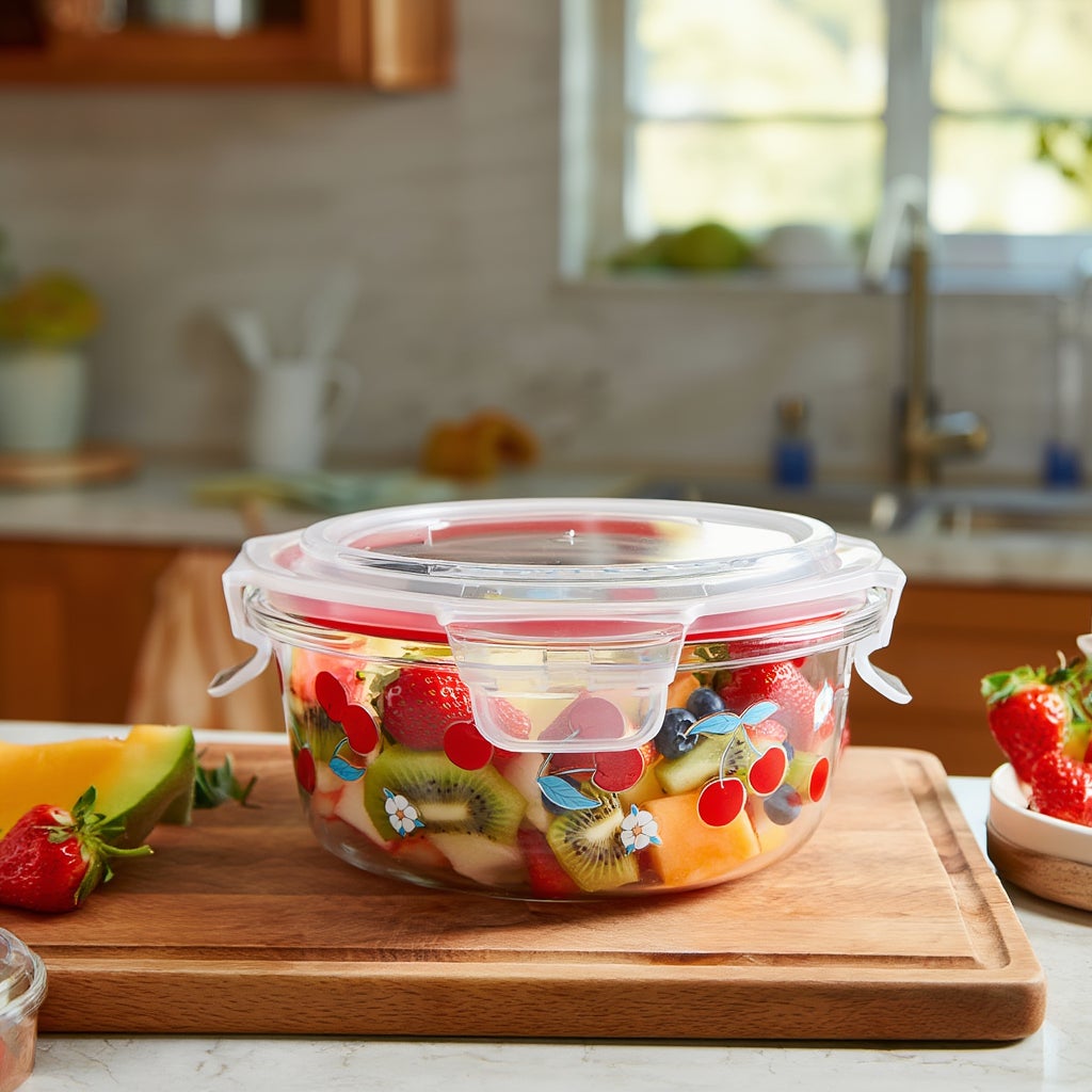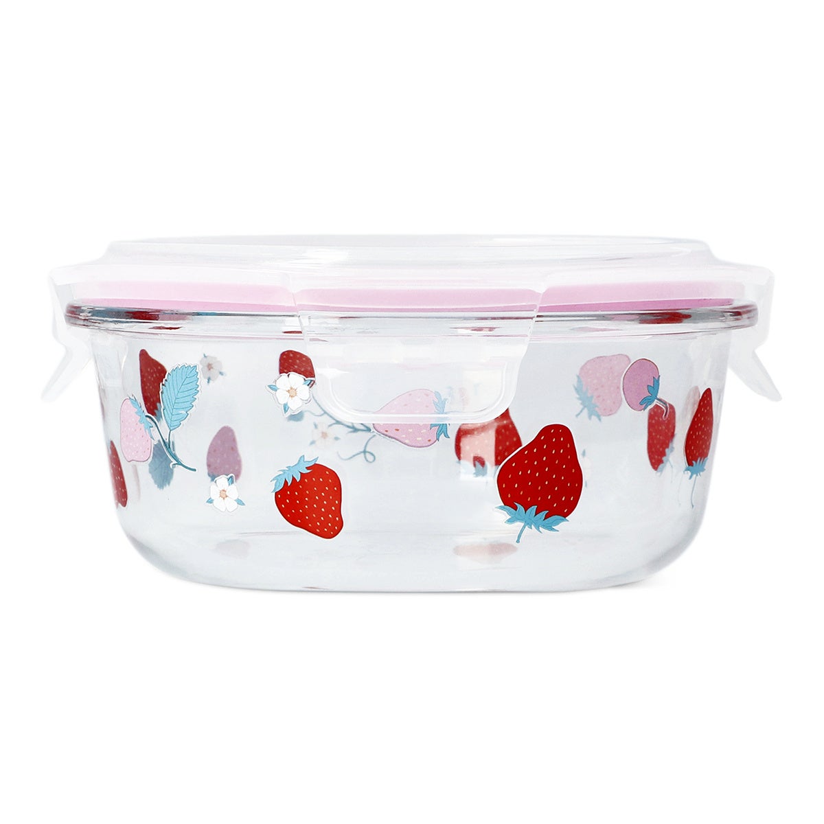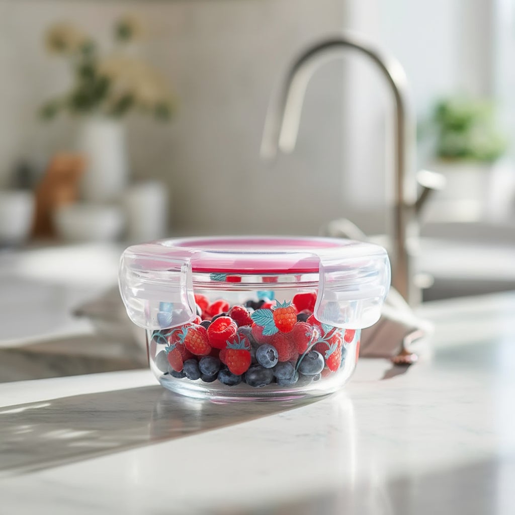 ラズベリー柄の幅11.6cm、高さ5.9cmのコンテナは、ちょっとした食材を保存するのに便利なサイズ。蓋を外して、ガラスのボウルとして使うのもありです。