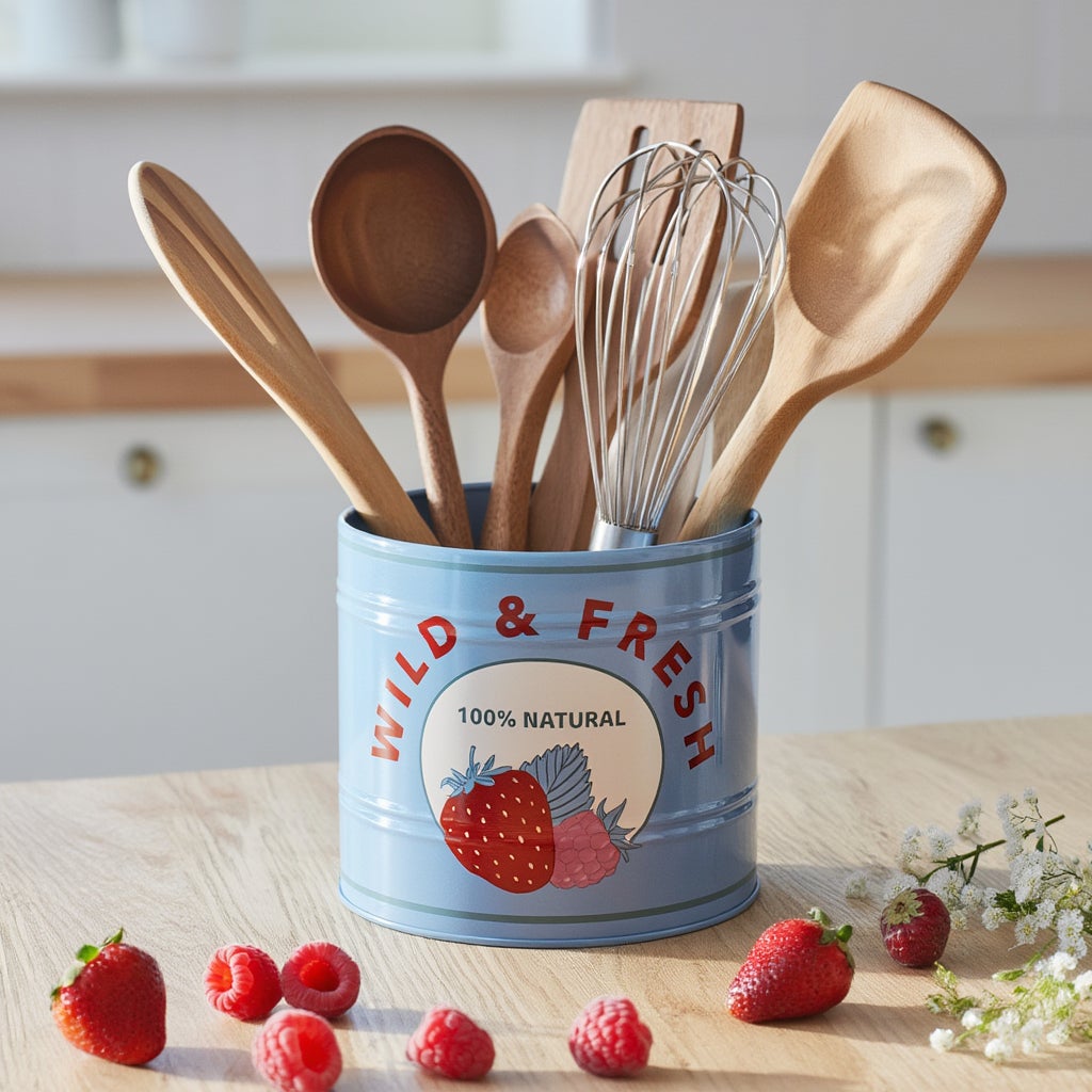ブルーカラーがキッチンのワンポイントに。高さ11cmで安定感あり。キッチン用具を入れても、インテリアに取り入れても◎